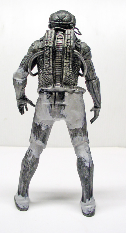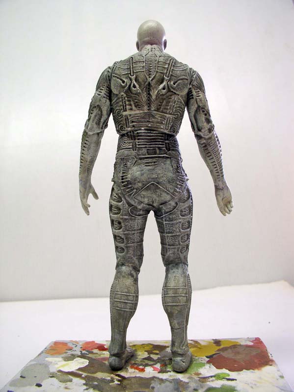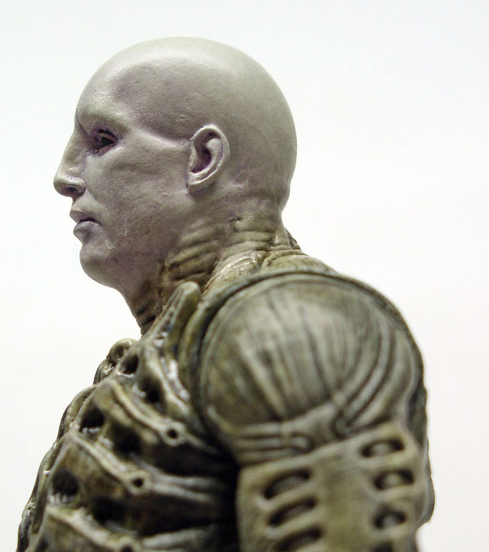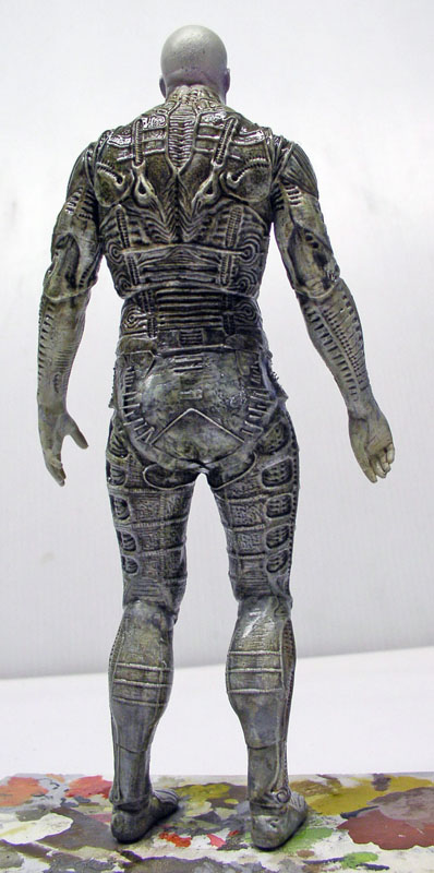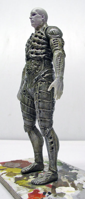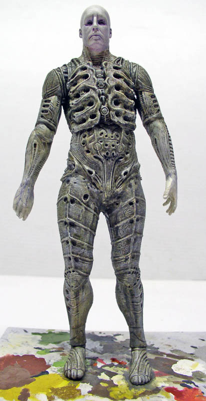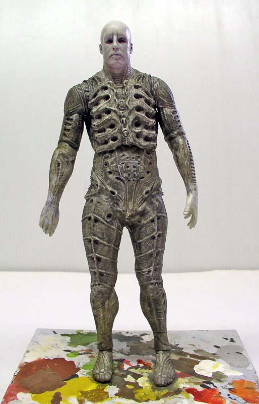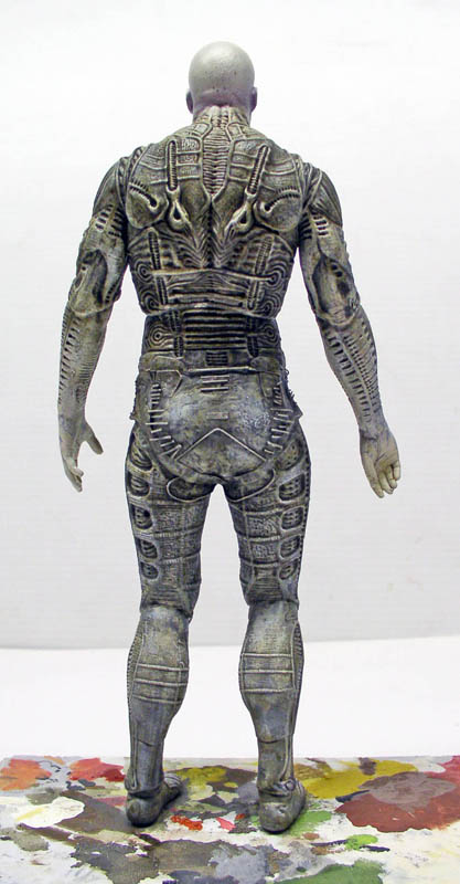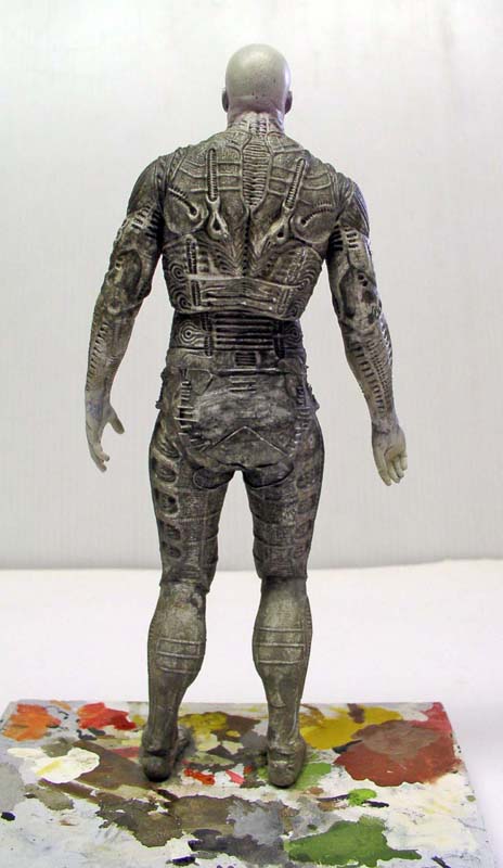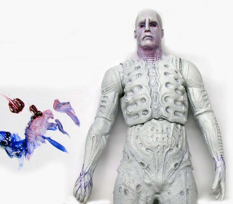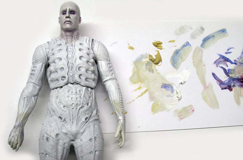 Une fois la question des joints réglée, on passe un apprêt acrylique sur l'ensemble de la figurine puis, après séchage on commence la peinture de la peau. On utilise de l'huile en tube pour artiste Winsor & Newton. On commence par les ombres en se basant toujours sur des photos du film à partir d'Alizarine Crimson et bleu de Phtalocyanine. On trace les veines sur les mains et quelques-unes au niveau du cou...