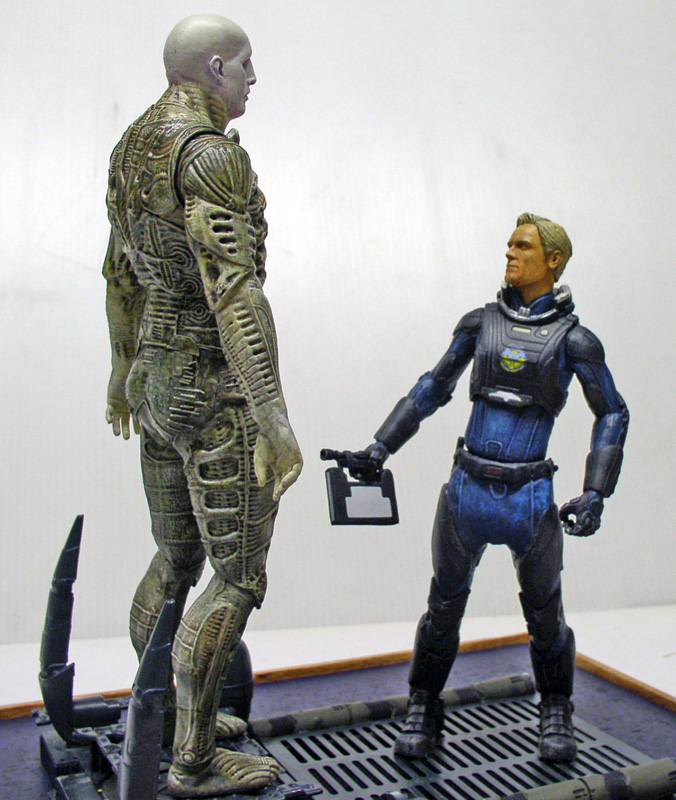 Here we go again, take 16 ! -  Not so hard, the neck tightening !  -  We're not savages after all !La marque NECA a édité des figurines articulées du film de Ridley Scott "Prometheus" en 180 mm à prix raisonnable, qui, après fixations des dites articulations et amélioration de la peinture des sujets, présentent  un réel intérêt de création d'un diorama pour le maquettiste...
