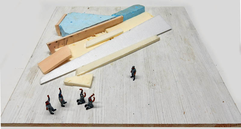 A 40cm square wooden slab to be covered with a white acrylic underlay. Pieces of extruded polystyrene will be used to make a buttress on the back...