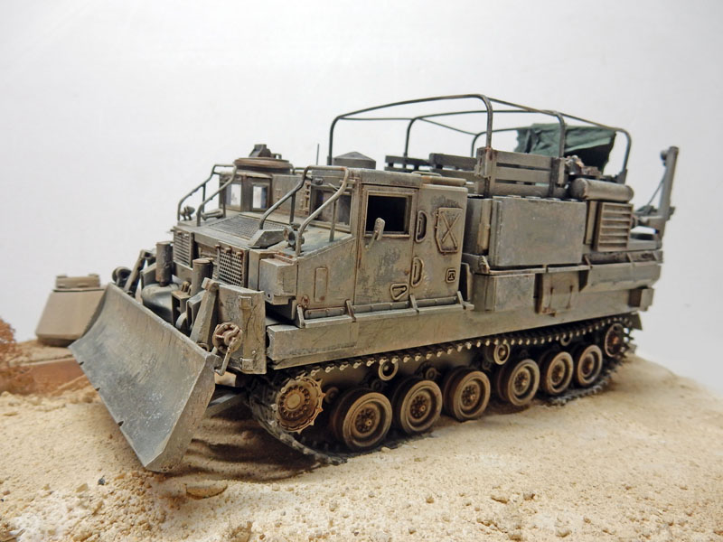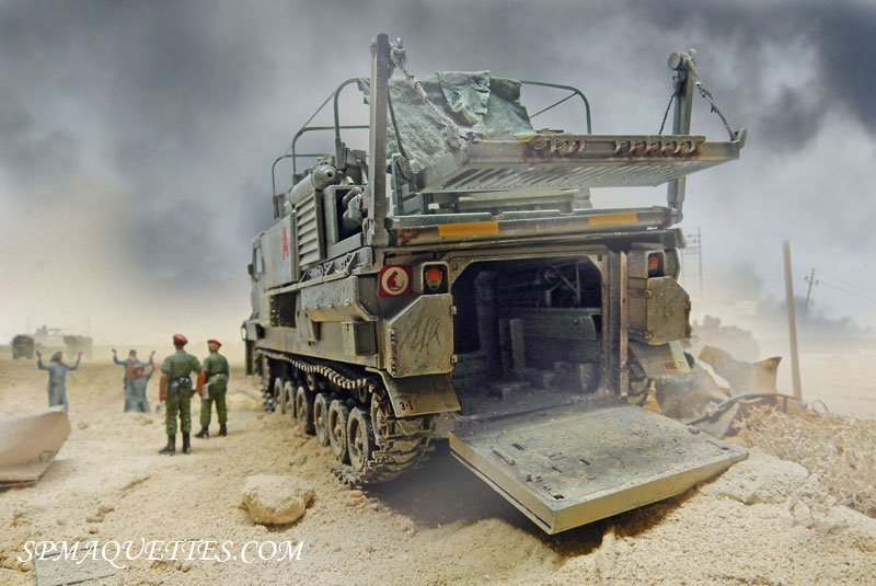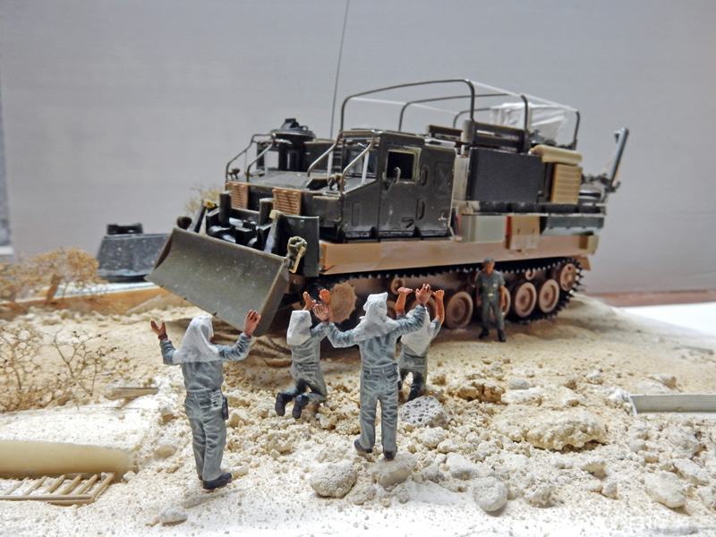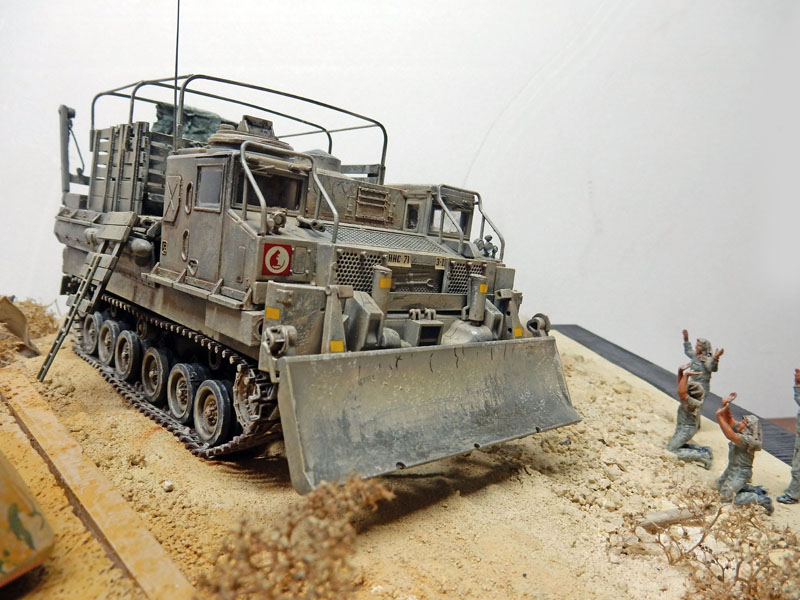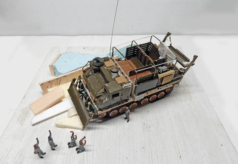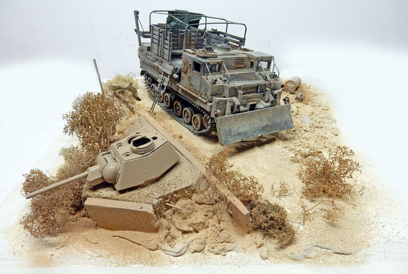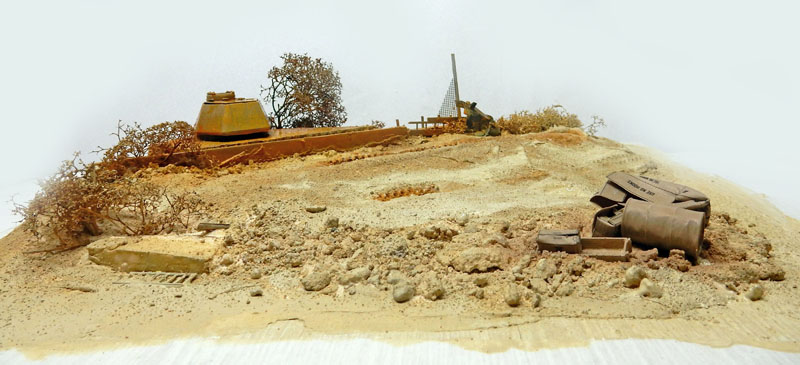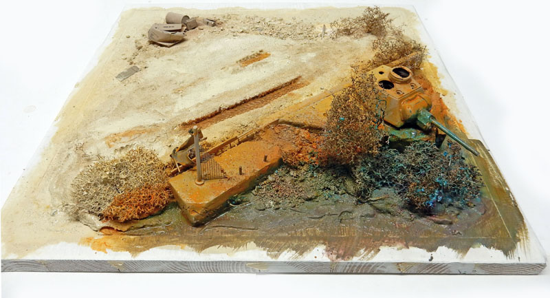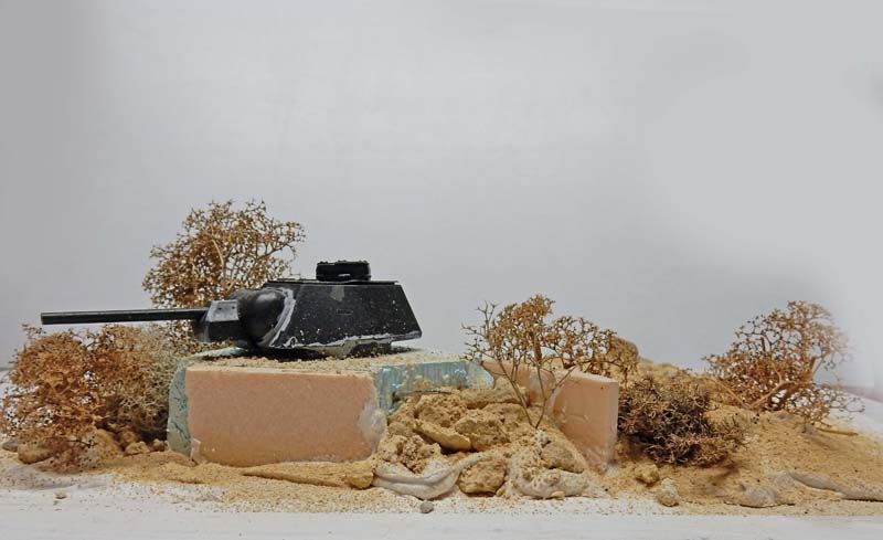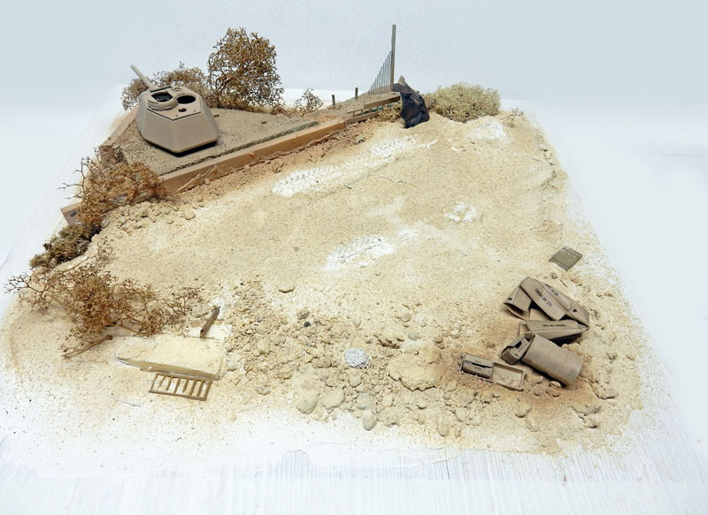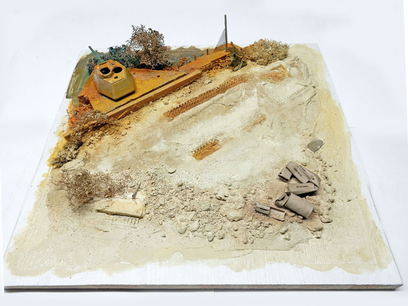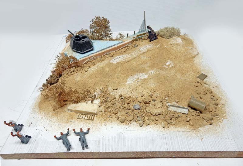 Mise en place de la maquette sur le support à la colle à bois à prise rapide. Pose des marquages et ensablement de la chenille. Empoussiérage du char. Collage des figurines...