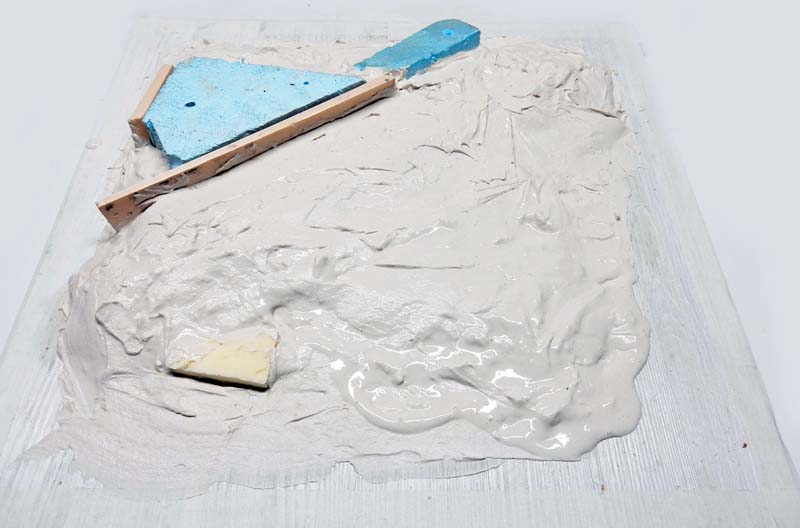 De la colle à carrelage va permettre - en séchant moins rapidement que le plâtre - d'effectuer les dénivelés du terrain et de poser les accessoires...