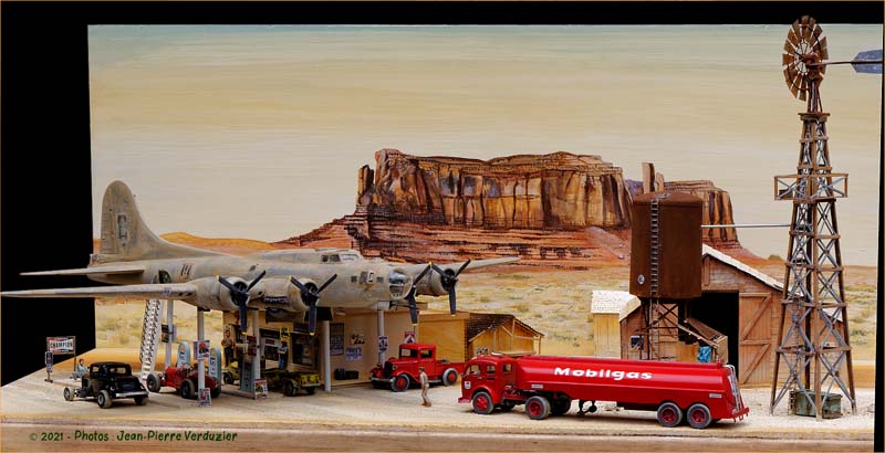 Le B17 : le héros de la BD - Lisa Dora, qui s'est posé dans le désert au retour de mission et que le père qui faisait partie de l'équipage a récupéré et érigé au-dessus de sa station-service...