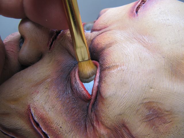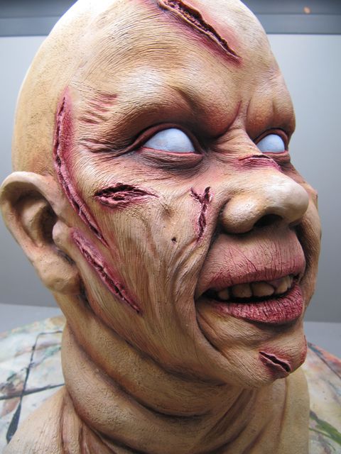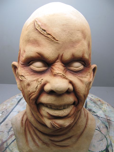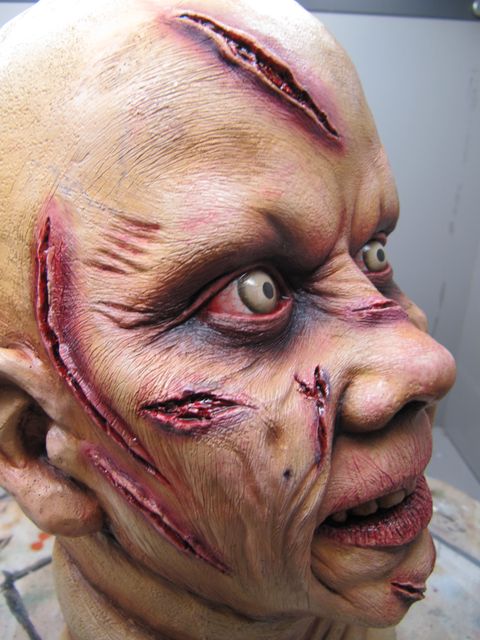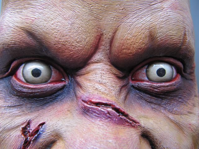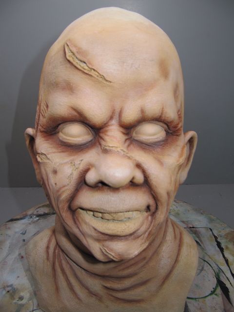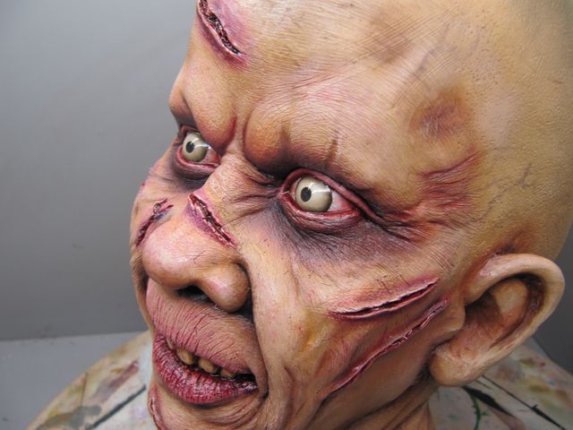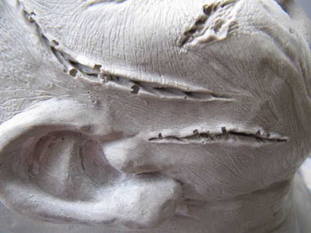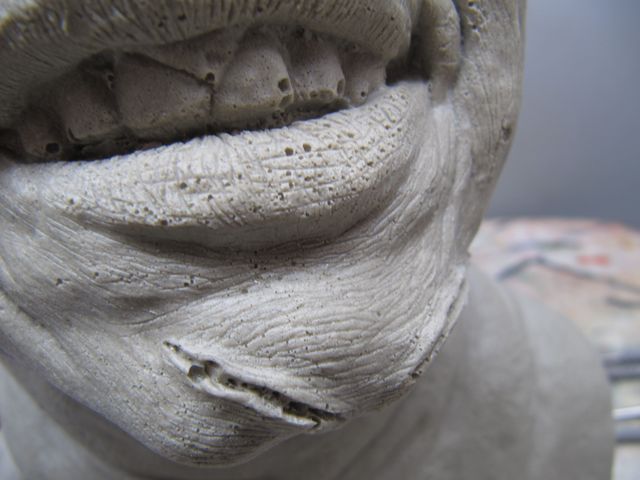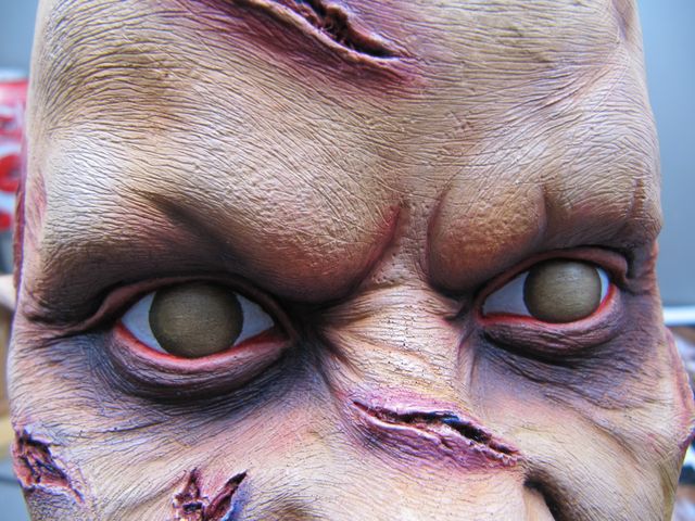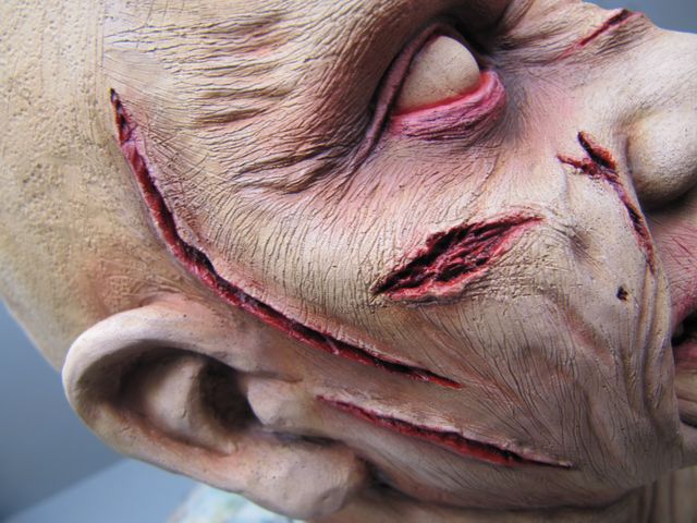 Les quatre photos ci-dessus : j'ai fait plusieurs retouches car après séchage, je me suis aperçu qu'il y avait besoin de rajouts: du noir dans les creux les plus profonds (plis au niveau du nez, de la bouche et des yeux). Un peu d'orangé à certains endroits. Le contour des cicatrices... Le fond des yeux est peint - blanc + une pointe de bleu (acrylique Citadel)...