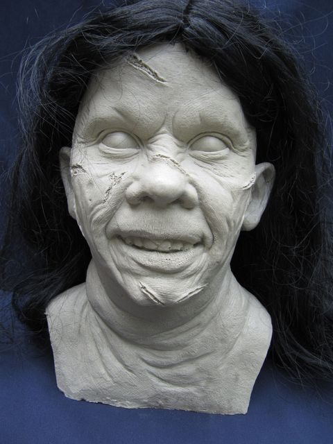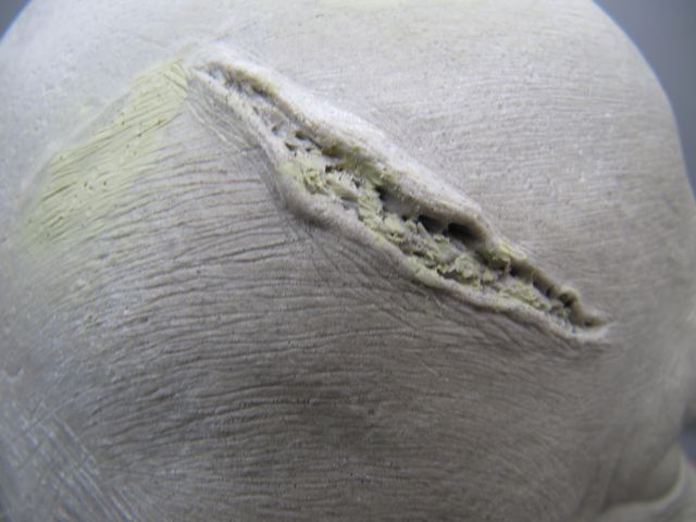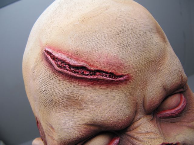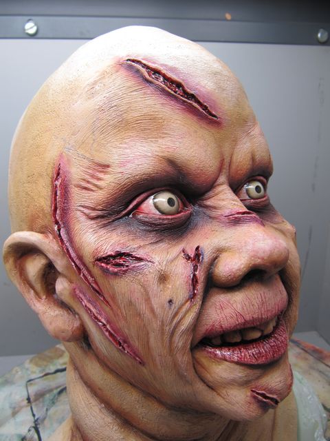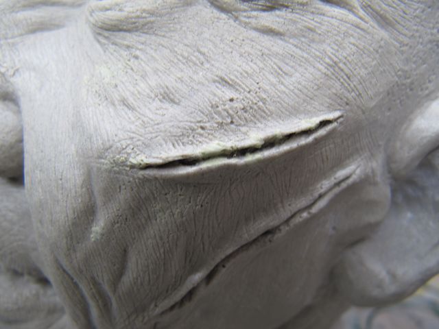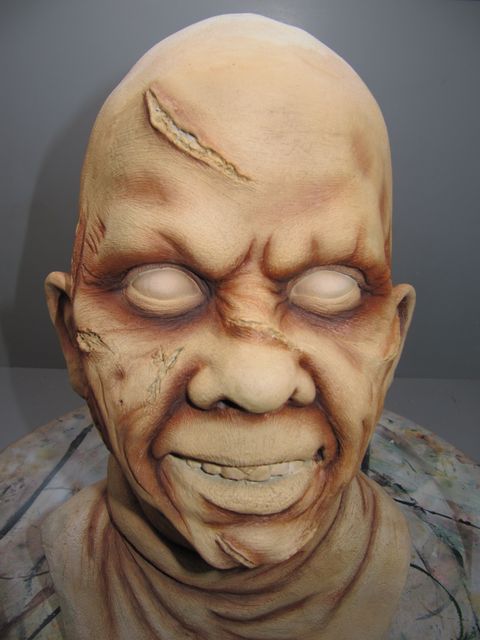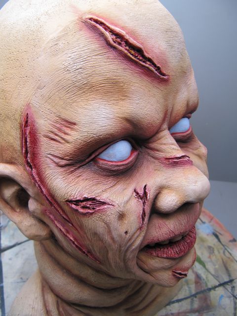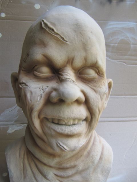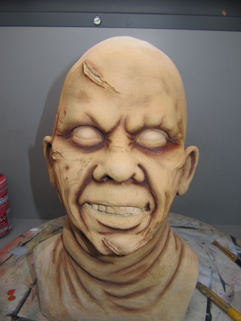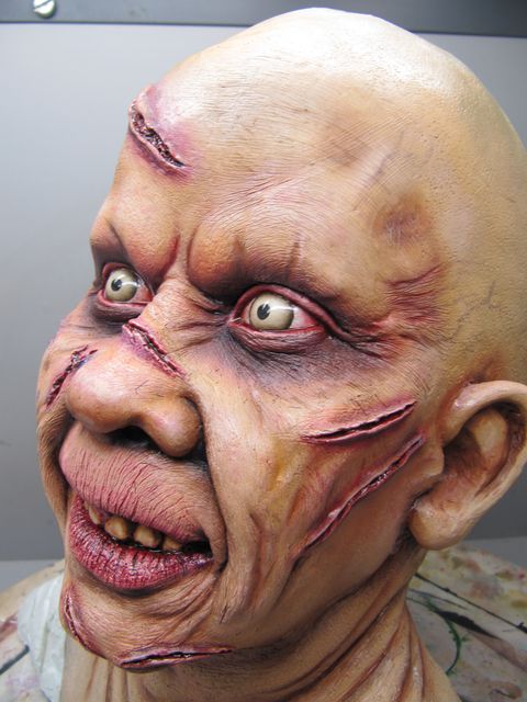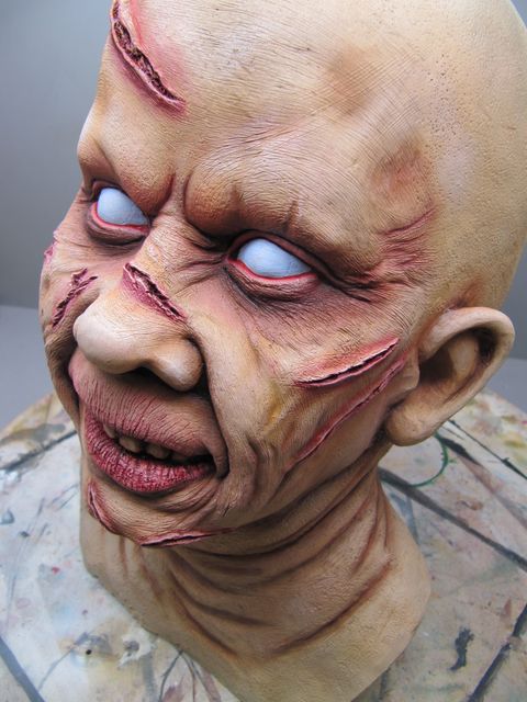 Les quatre photos ci-dessus : j'ai fait plusieurs retouches car après séchage, je me suis aperçu qu'il y avait besoin de rajouts: du noir dans les creux les plus profonds (plis au niveau du nez, de la bouche et des yeux). Un peu d'orangé à certains endroits. Le contour des cicatrices... Le fond des yeux est peint - blanc + une pointe de bleu (acrylique Citadel)...