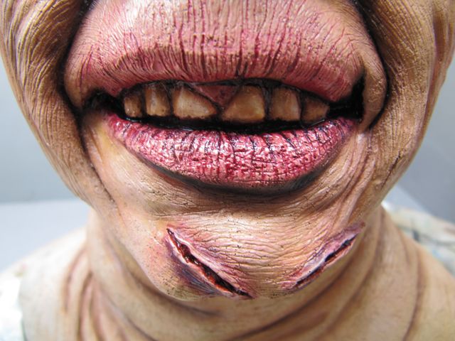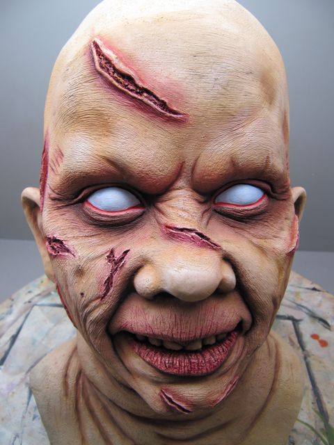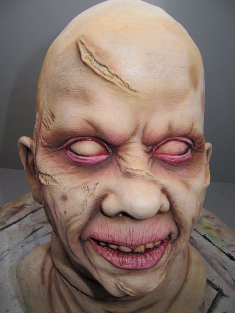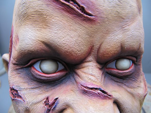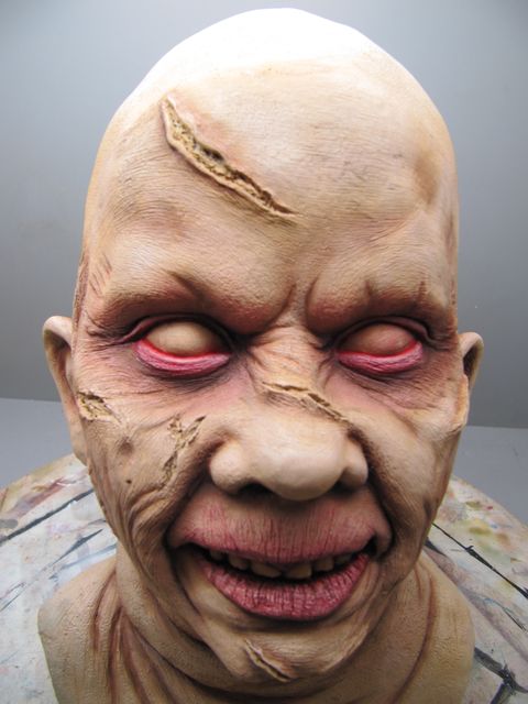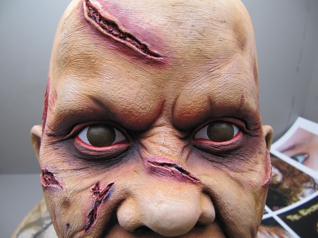 Il ne reste plus à peindre que l'iris. Ci-dessous les photos (presque) finales. J'ai fait les dernières retouches, surtout dans les yeux et passé un vernis brillant. Le final aura lieu avec la perruque (il faut que je m'improvise coiffeur !!!) et une chemise de nuit sur les épaules... Cela donne un effet "poupée", mais vu le thème, je n'ai pas honte...