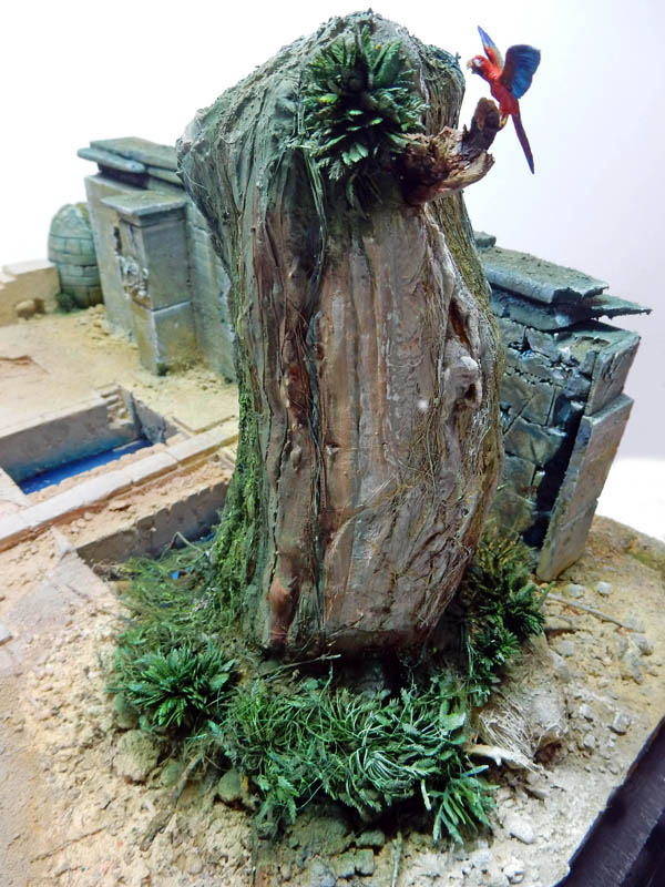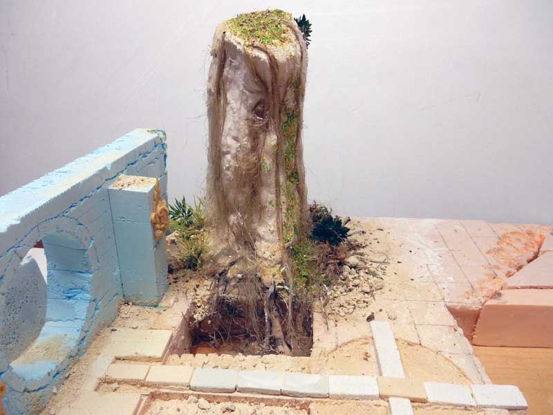 Une autre vue montrant le bas de l'arbre dans le bassin. Des plantes séchées, des plantes en plastique, des pierres et de la poussière de différente épaisseur ont été disposées autour...