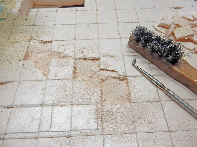 Gravage des dalles du sol et disposition des différents éléments. Des gouttes d'acétone permettent de creuser la texture pour donner des effets intéressants...