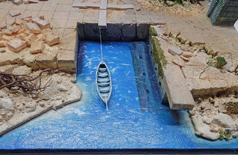 "Trompe l'oeil" painting of the location of the boat, the reflection of the quay in the water and the banks...