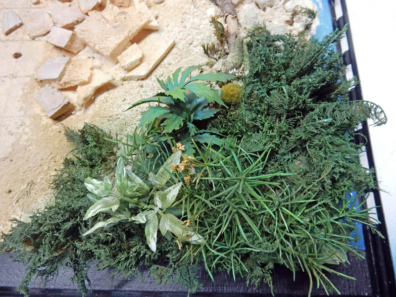 On ajoute du plâtre que l'on laisse durcir légèrement puis on grave avant séchage. De la filasse de plombier et des vraies racines sont insérées en même temps pour simuler des lianes...