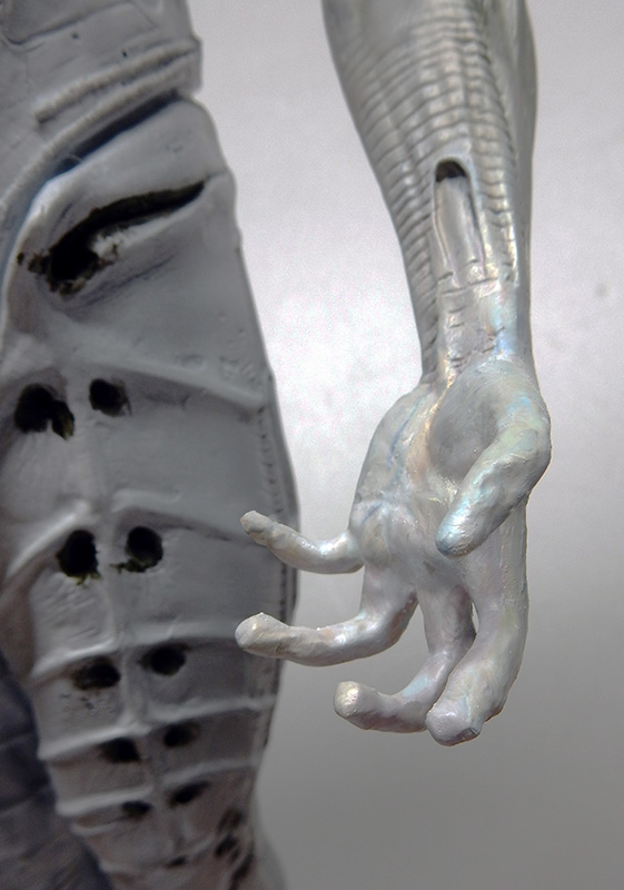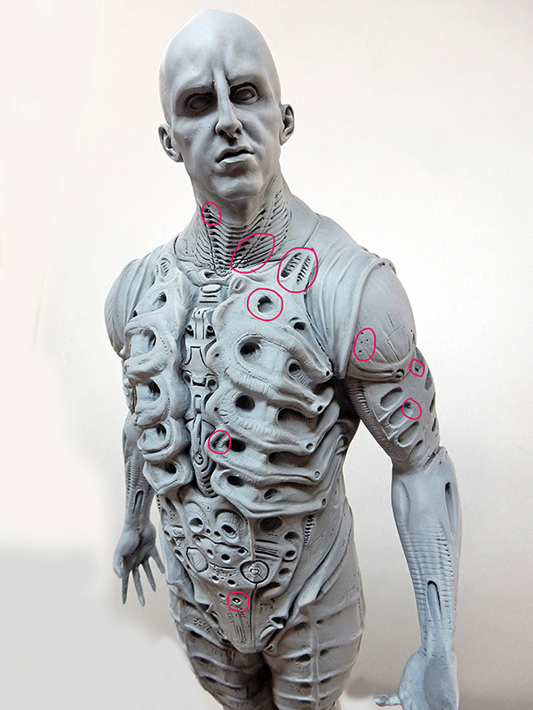 The character's costume features numerous cavities and holes. Following demolding, resin beads have lodged themselves all over the interior and need to be removed before painting. In the photo, you can clearly see one of them in the bottom line...