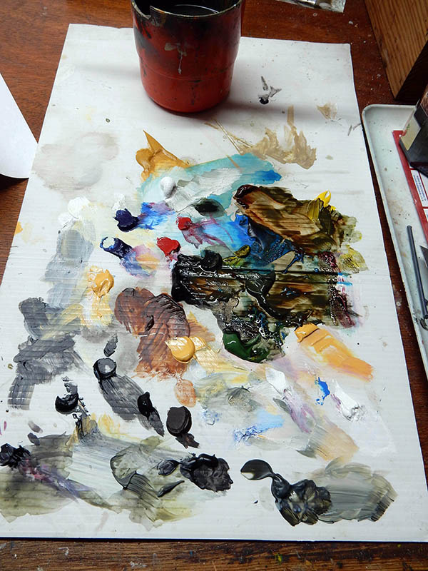 We start by blackening all cavities - black, Payne grey, burnt umber - (left side of chest). Then we use burnt green, dark olive, burnt umber, primary yellow (right side)...