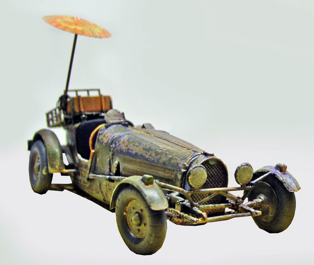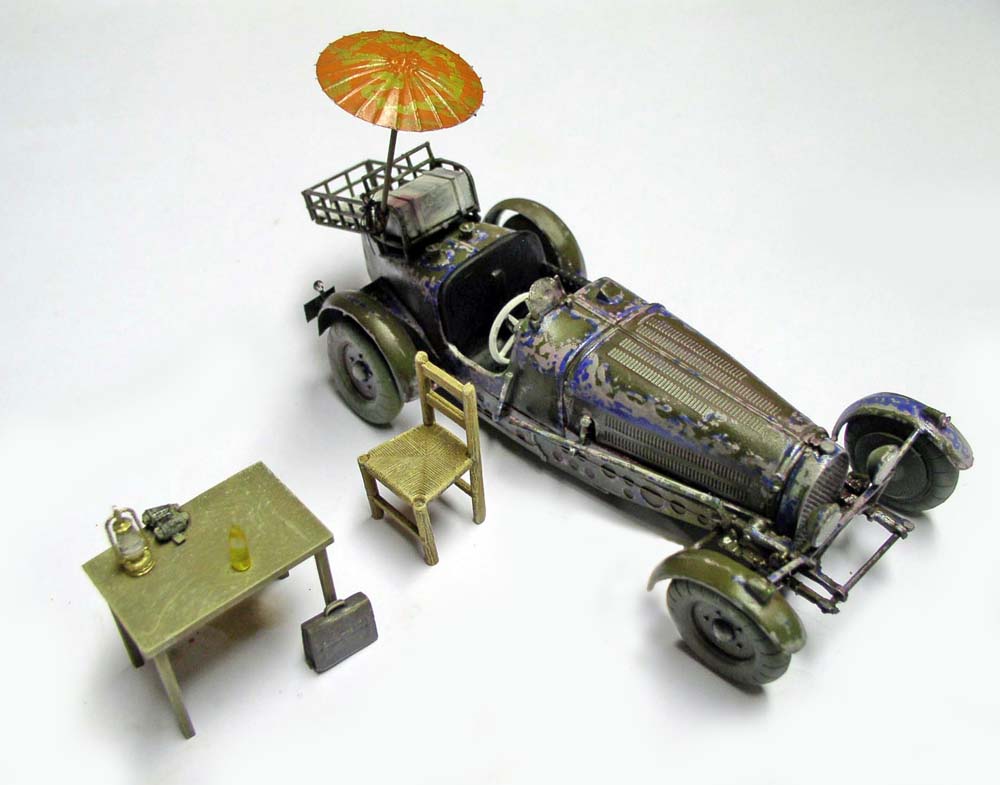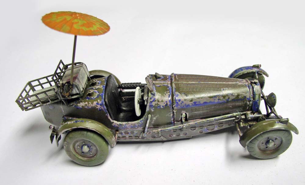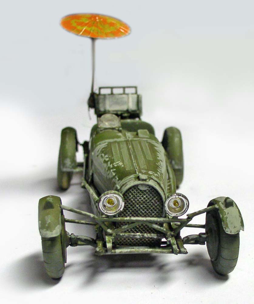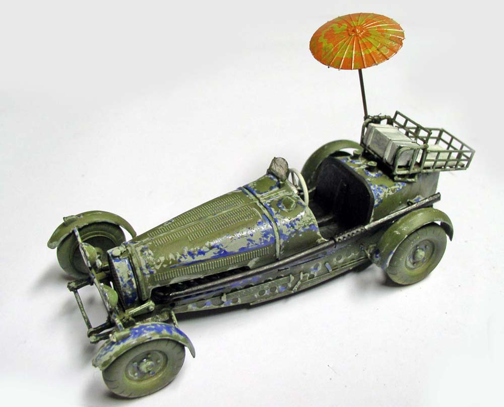 La voiture a été modifiée pour en faire un véhicule de BD. Un porte-bagage a été rajouté et les jantes à rayons sont remplacées par des "pleines". La peinture de base est un HI-2 overall green de Humbrol...