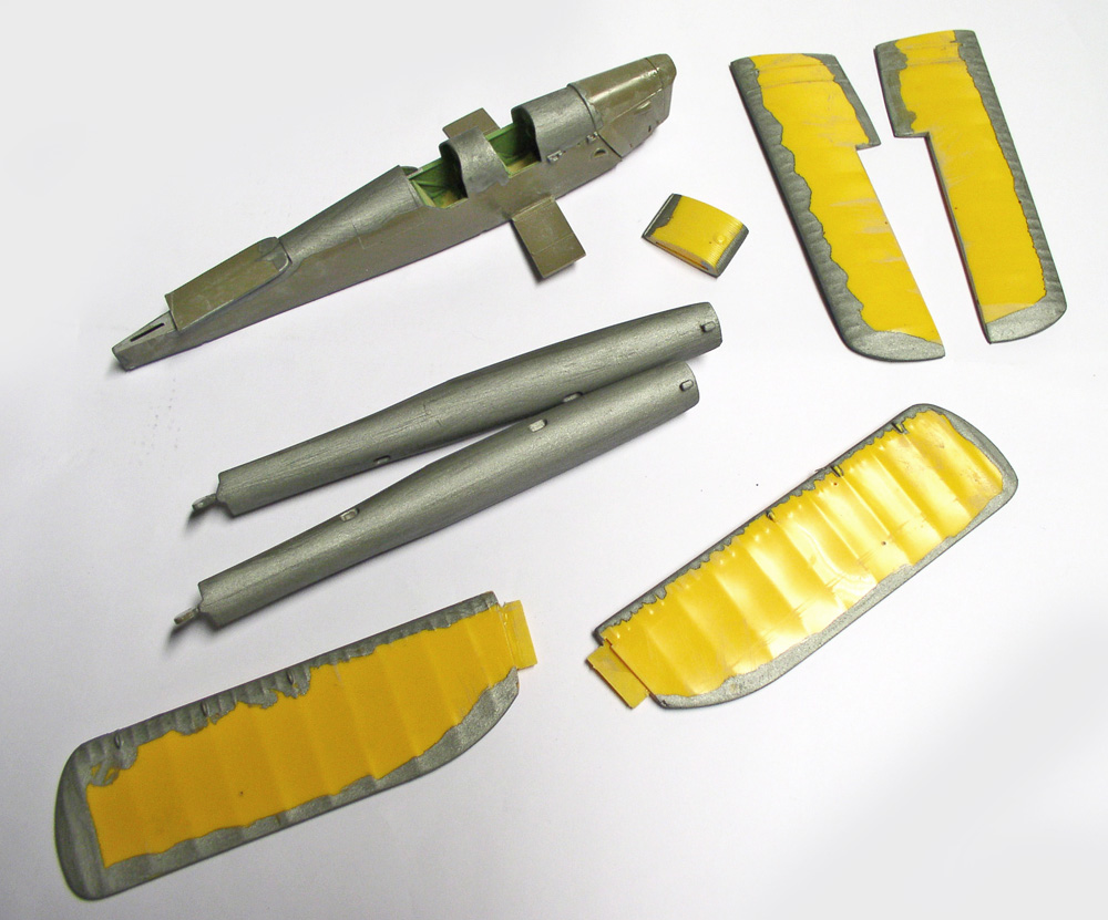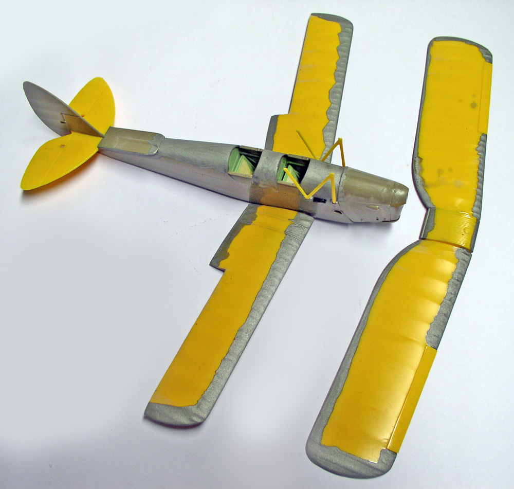 Given the kit's age, the more or less warped wing and float attachments are replaced by Evergreen parts...