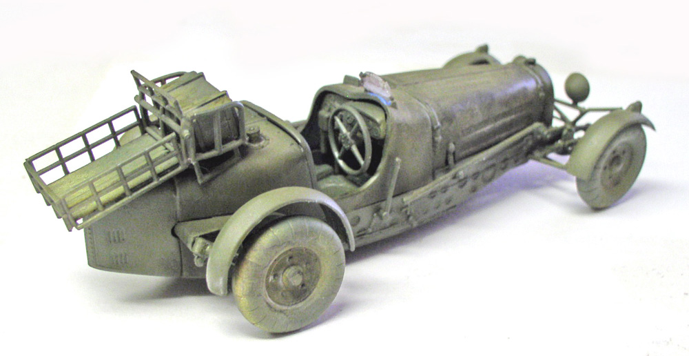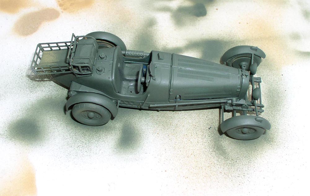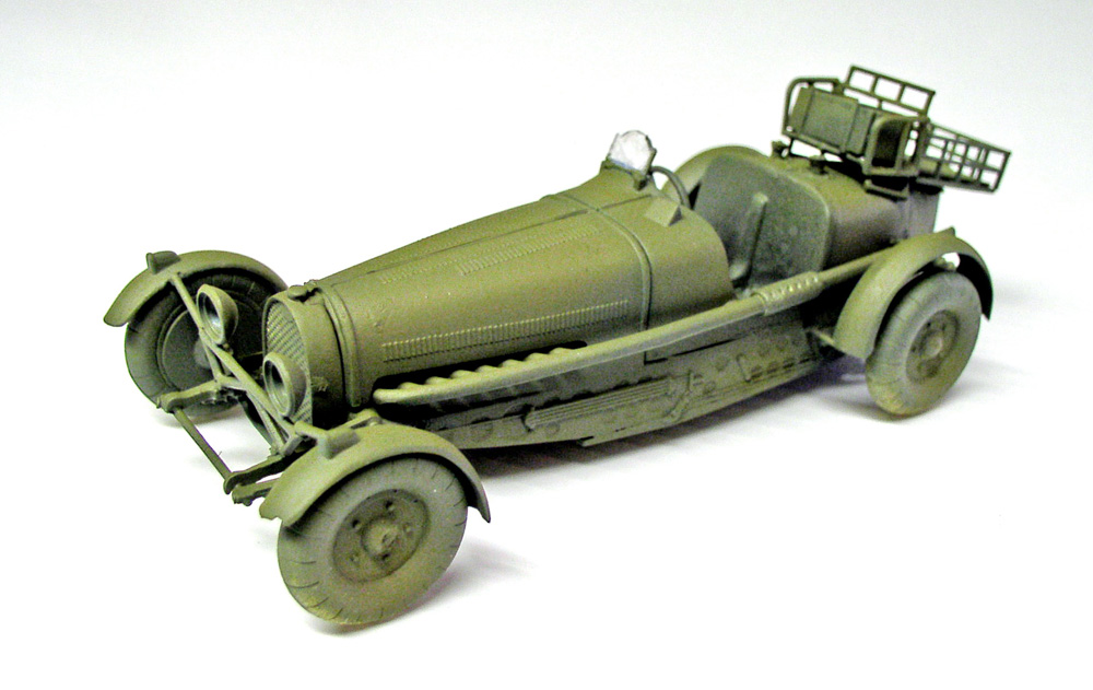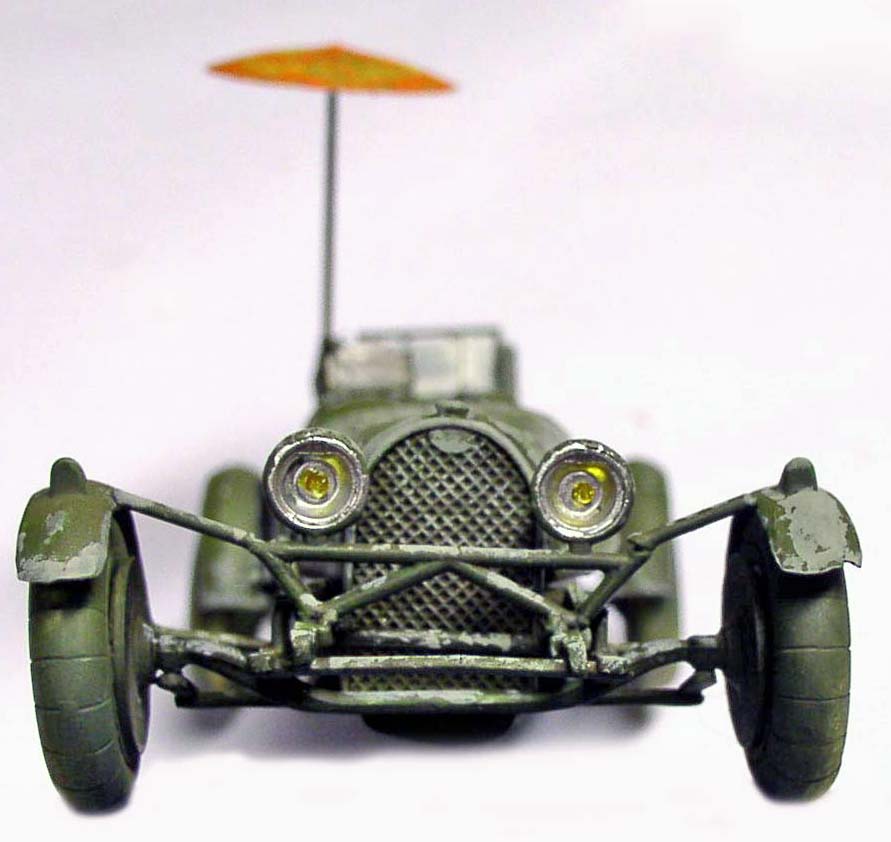 The car has been modified to make it a comic-book vehicle. A luggage rack has been added and the spoked rims have been replaced by "solid" ones. The base paint is HI-2 overall green from Humbrol...