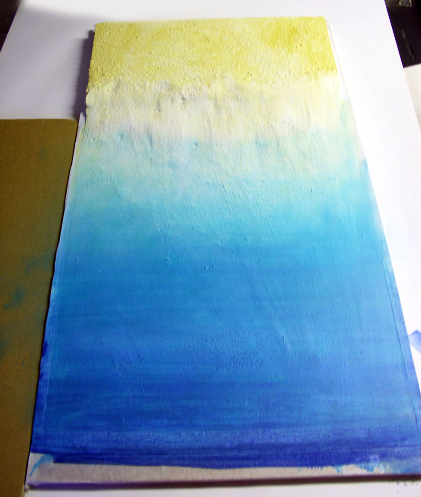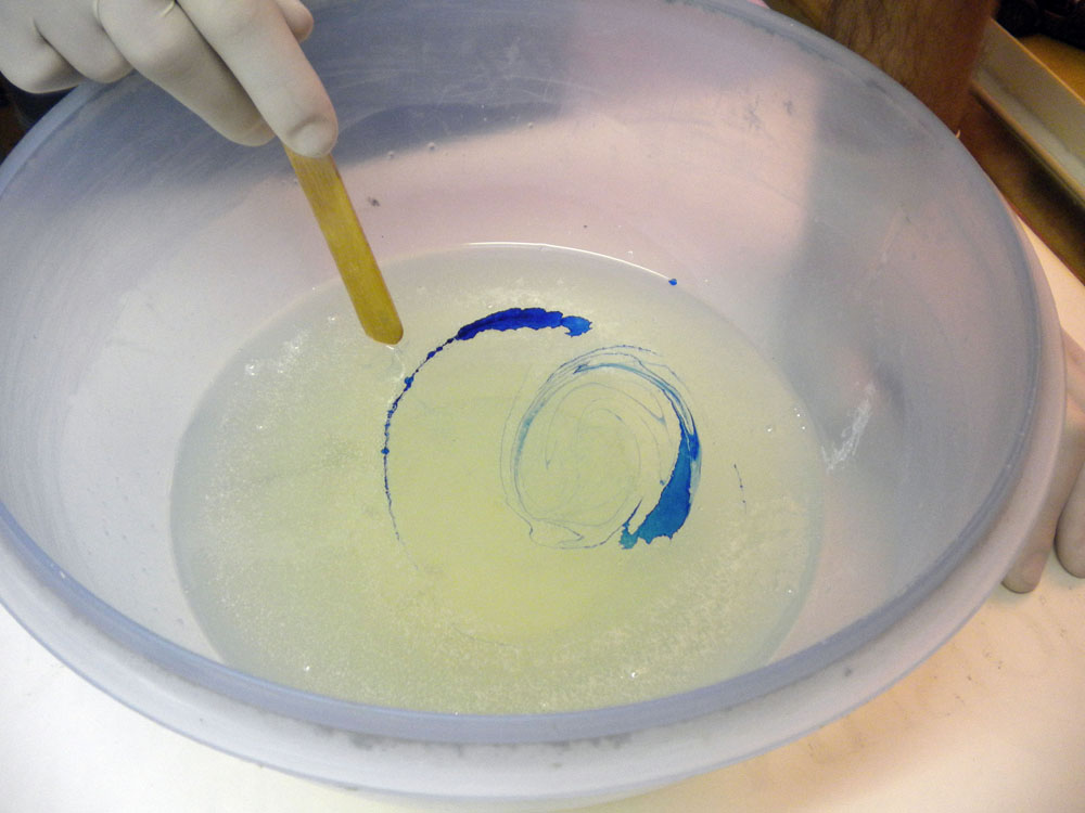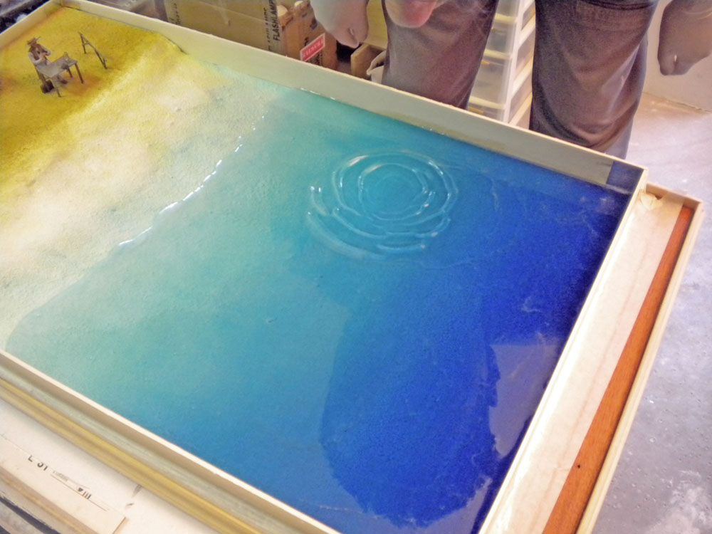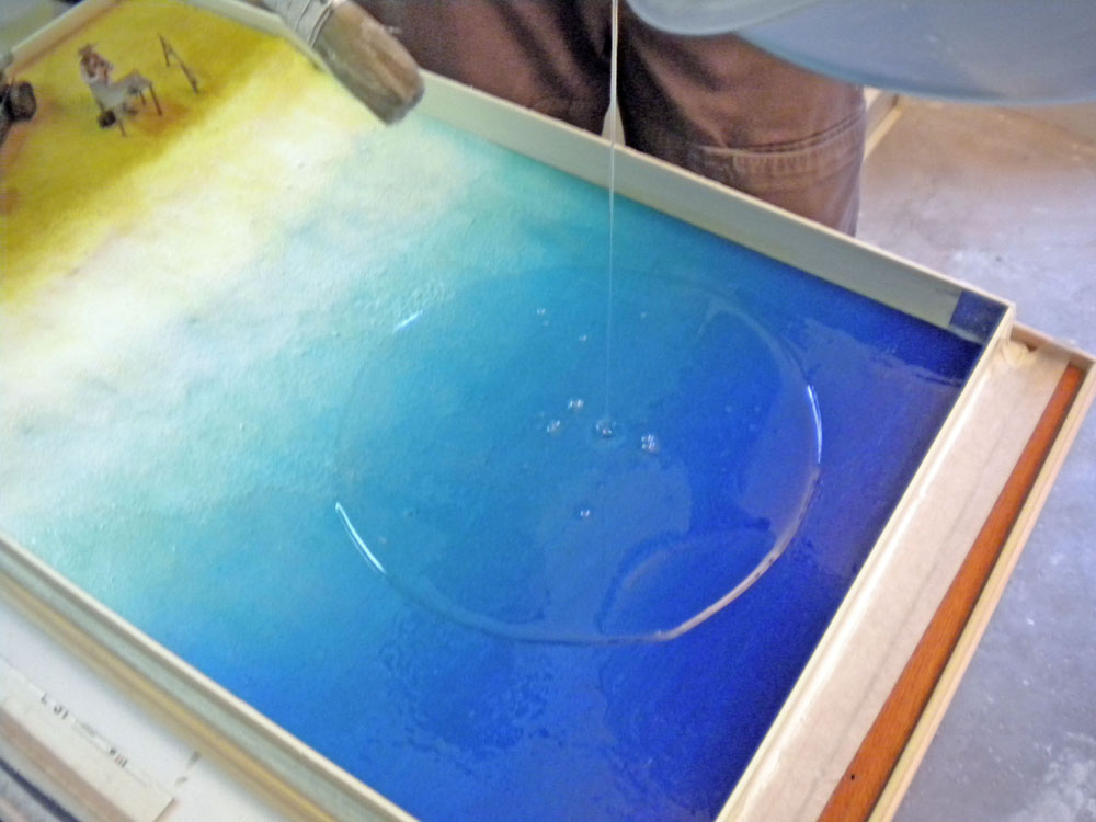 As soon as the second layer has been poured, the wave foam is applied. Liquitex acrylic gel is applied with toothpicks and shaped...
