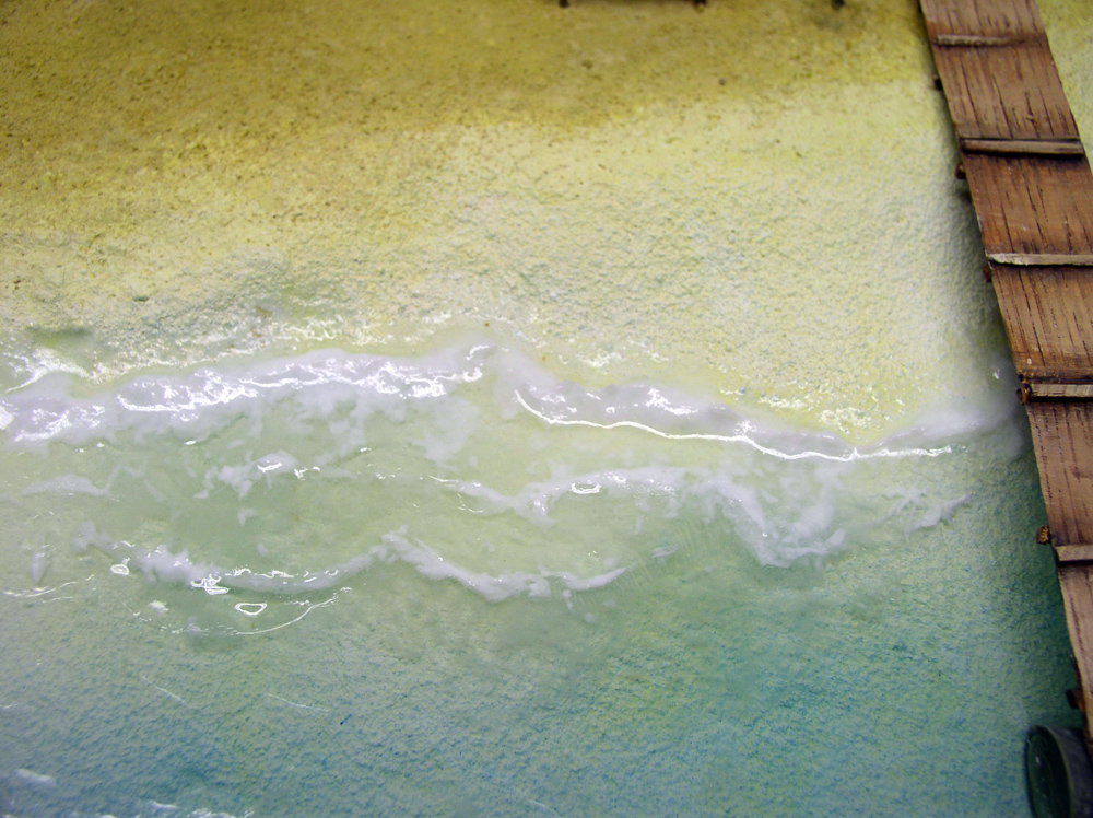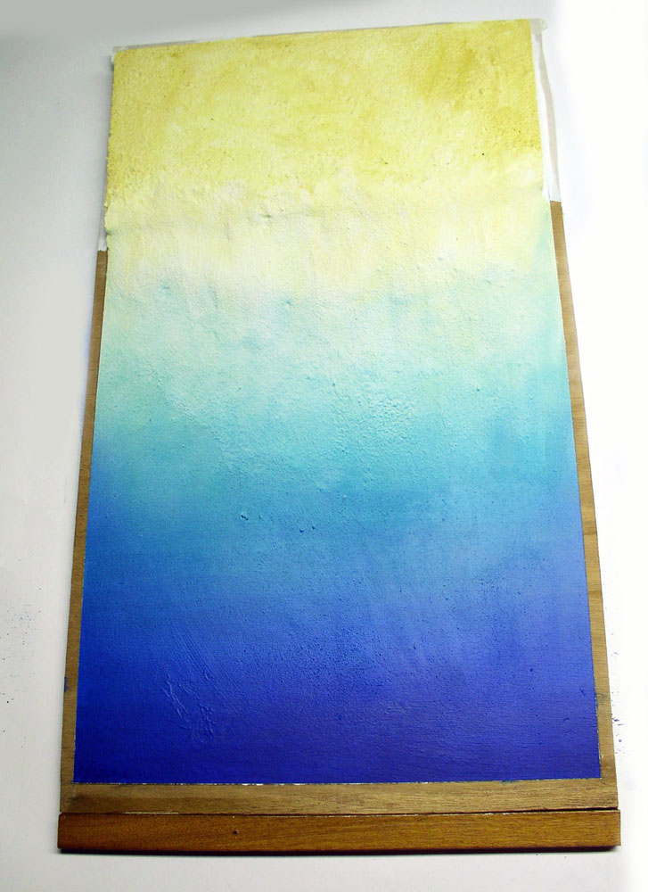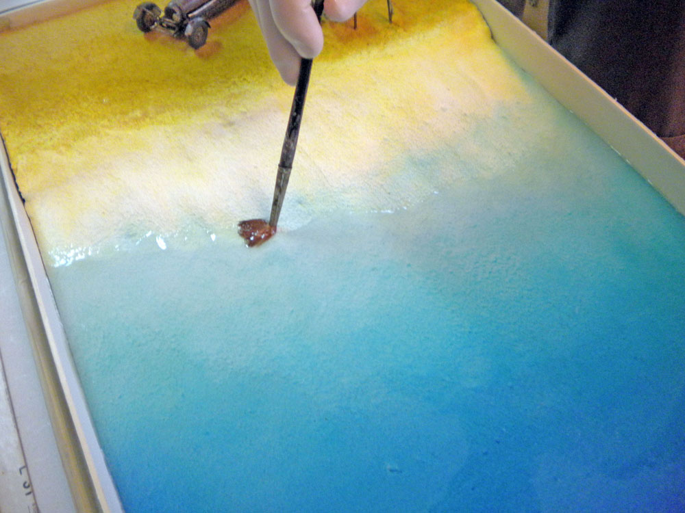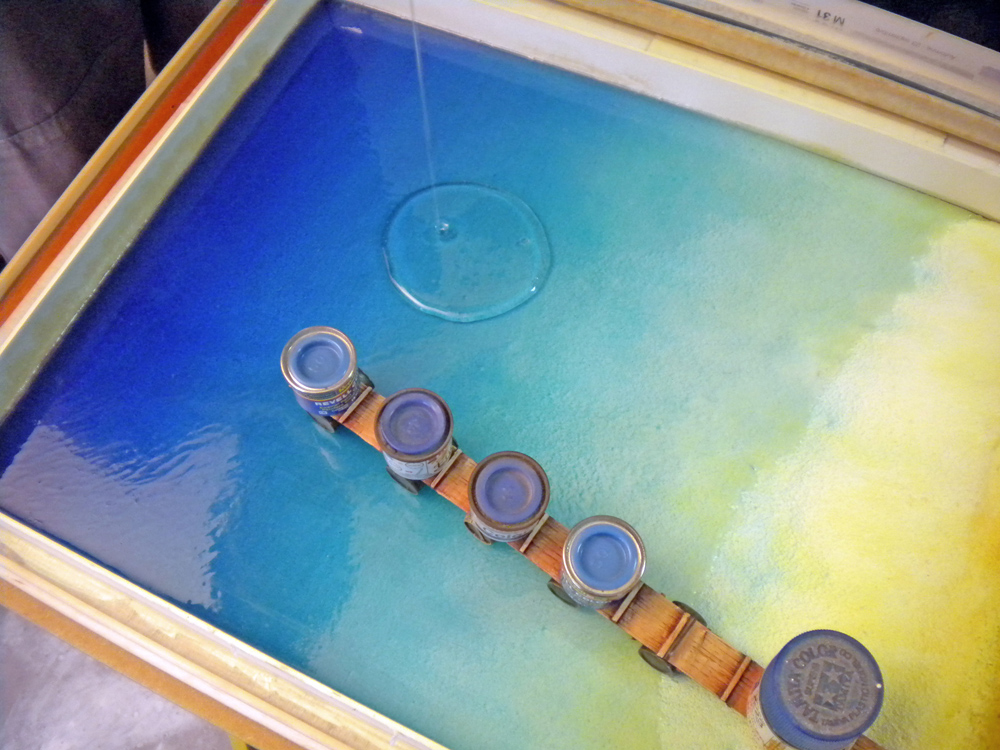Dès la coulée de la seconde couche, on procède à la pose de l'écume des vagues. Du gel acrylique Liquitex est déposé à l'aide de cure-dent et mis en forme...