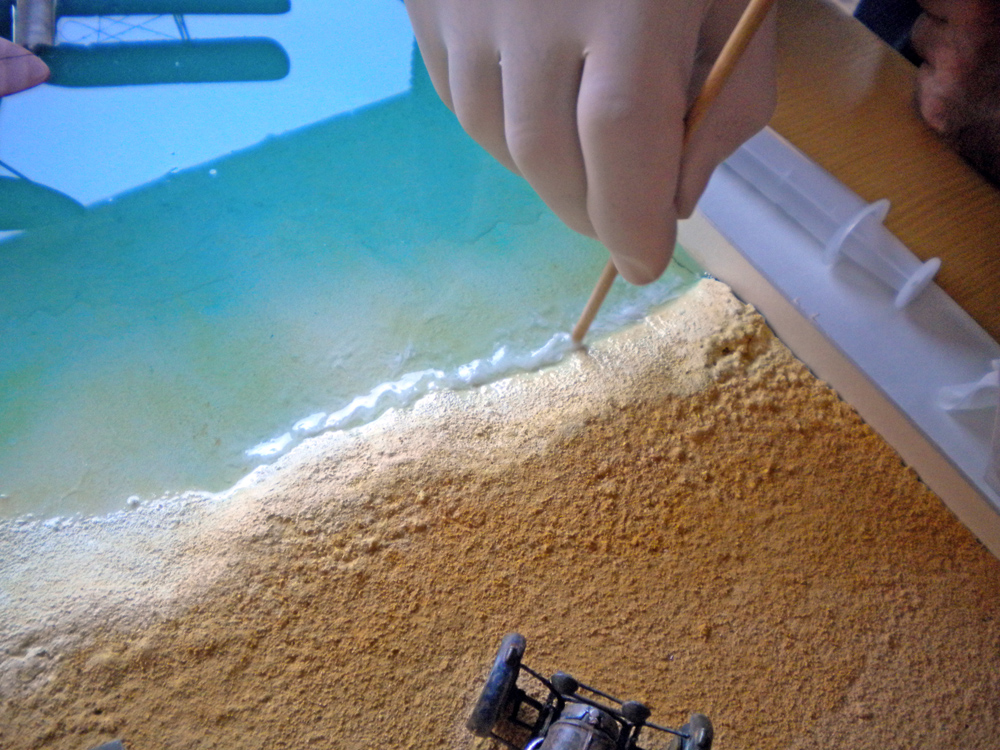 Ce diorama est l'occasion d'une première approche des techniques de résine pour rendre les effets d'eau et de mer. La résine utilisée ici n'a pas concrétisé nos espérances, mais elle a permis de mieux cerner les problèmes propres à ce matériau. C'est une résine époxyde (la résine polyester est à éviter absolument car elle travaille TOUJOURS dans le temps) aéronautique non vendue aux particuliers. Sa principale qualité est le faible rétrécissement des bords au séchage...Une autre marque plus facile à se procurer fait l'objet d'un tutorial ici montrant la technique pour réussir "sa" résine pas à pas...