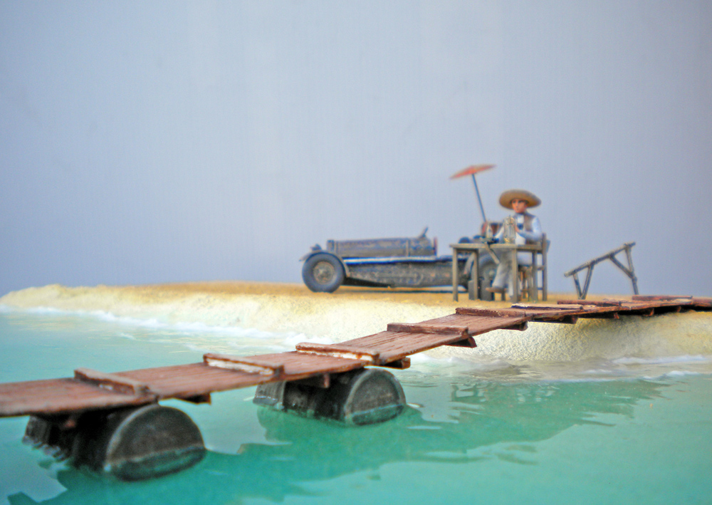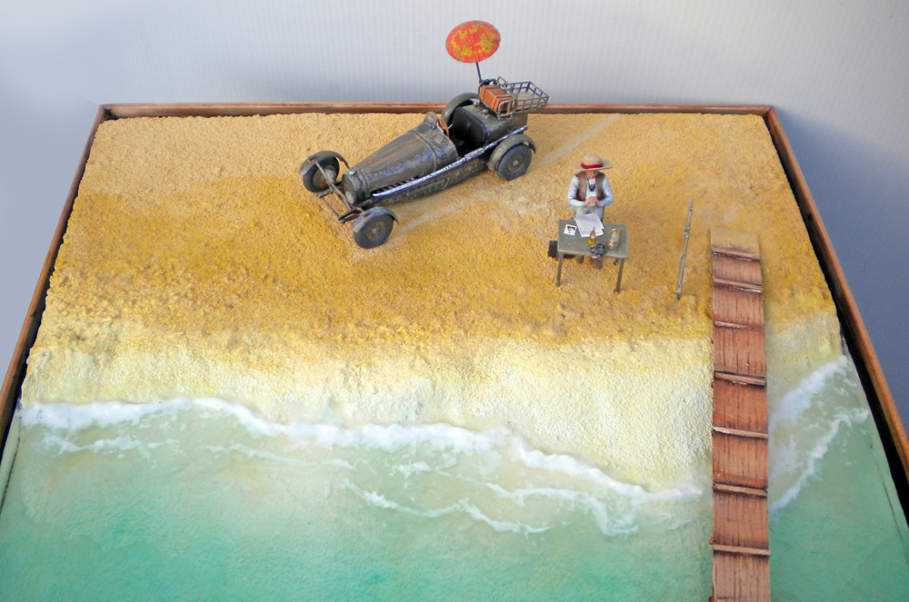 The decor. Extruded polystyrene and plaster of Paris for the sand, wood for the background...