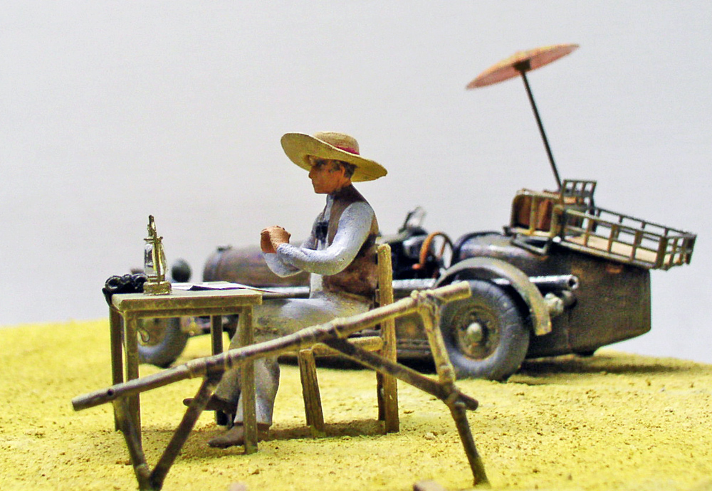 La peinture employée est l'huile Humbrol. Ici, une couche de sable clair a été passée pour uniformiser l'ensemble et du 160 a permis d'ombrer l'appareil...