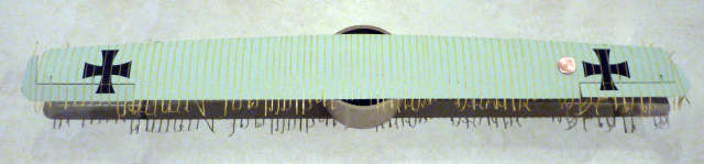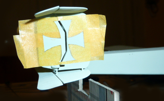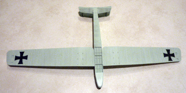 Masking is complete. Light grey pastel applied with a cotton swab brings out the ribs of the wings and fuselage structures...