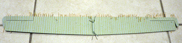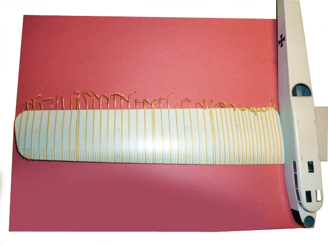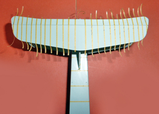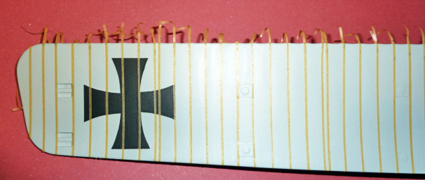 Laying the strips on the top wing; 11.60m of 1 mm wide strips are glued, and about a good meter of ½ mm strips!!!! The scale can be appreciated in relation to the piece installed...