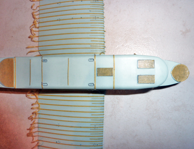 Le masquage est terminé. Du pastel gris clair appliqué avec un coton tige permet de faire ressortir les nervures des ailes et structures du fuselage...