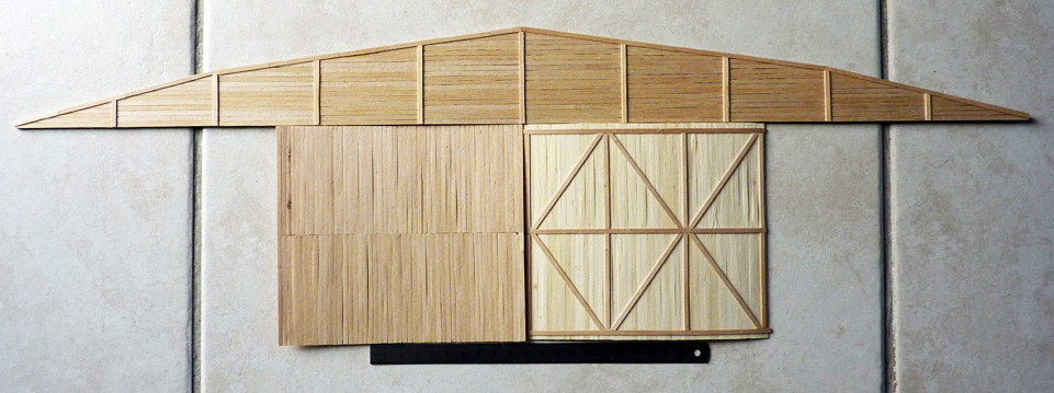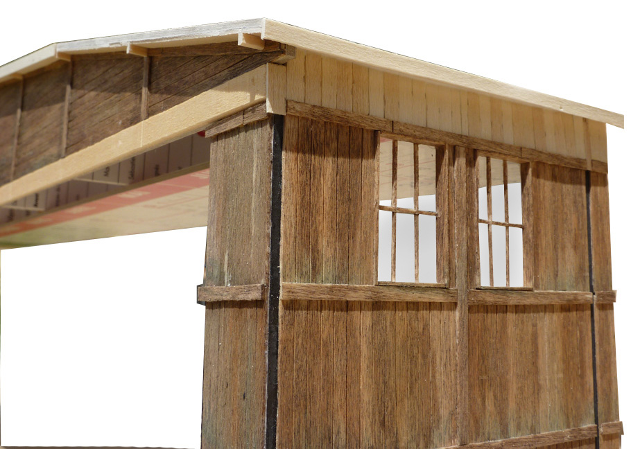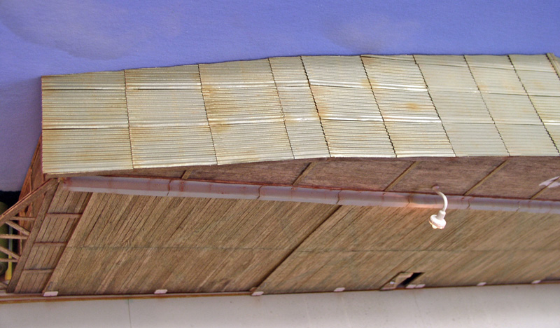 La toiture est faite avec du carton ondulé très fin et découpé, acheté en magasin d’art très fin. La protection des rails de guidage des portes est réalisée à partir de boîtes de coca découpées...