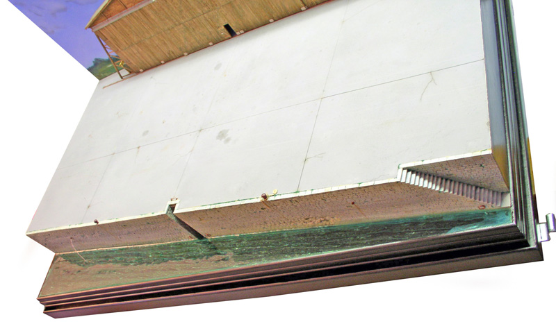 ...Après avoir retirer les agrafes, on les trempe dans de l'eau bouillante 5mn puis on les passe au fer à repasser pour les rendre bien droits et planes. Après un ponçage, on coupe chacune des planches et les fixe sur la structure du hangar ou des portes également en bois...