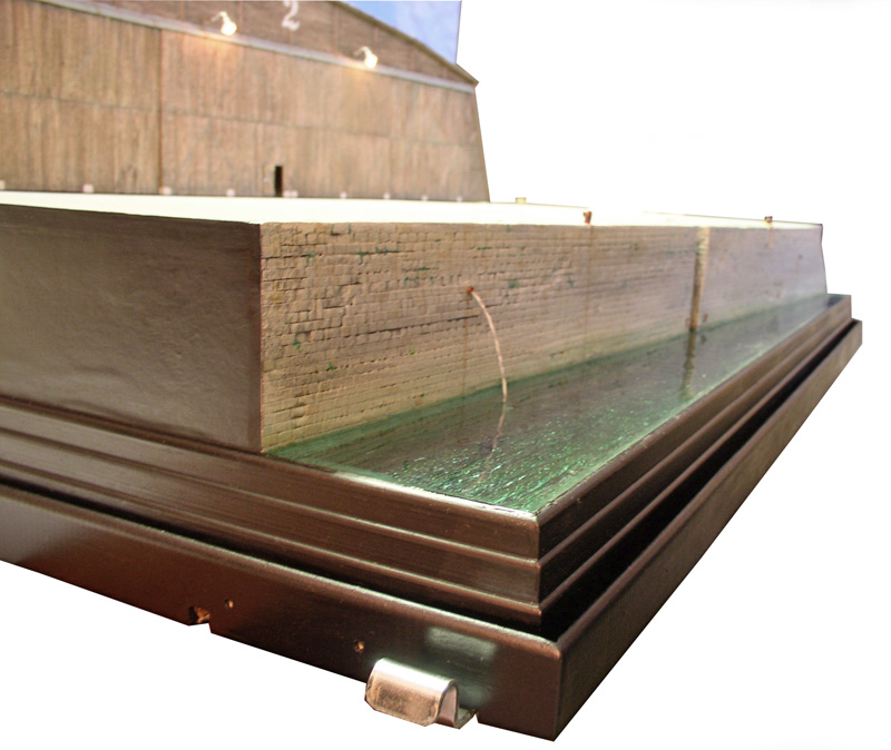 Dock fabrication. Extruded polystyrene with stone engraving. Wooden structure for the frame. The track is made of cardboard sheets fitted and glued together...