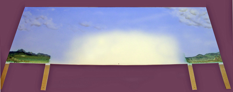 Peinture du fond du décor en "trompe l’œil". Feuille de dessin collée sur panneau contreplaqué et peinte à l’acrylique. Nuages au pochoir…