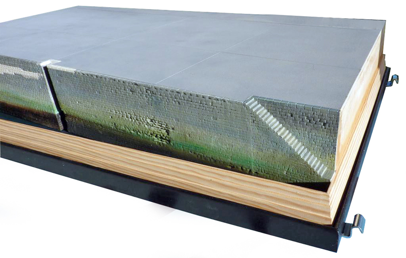 Fabrication du quai. Polystyrène extrudé gravé façon pierre. Structure bois pour le chassis La piste est constituée de plaques de carton ajustées et collées ensemble...