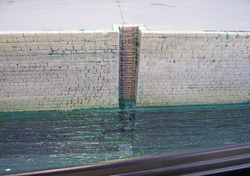 L'eau qui coule est très simple, il suffit d'y penser. L'eau qui sort d'un robinet ne coule jamais droite, elle vrille. On prend deux bouts de fil de pèche que l’on torsade et colle à la colle Superglue. On perce la résine et fait glisser un centimètre de cette torsade puis on colle afin de voir par transparence de l'eau la force du jet. L'eau qui éclabousse est du silicone translucide (pour joint de salle de bains) appliqué au cure-dents, puis avant séchage repiqué avec le même cure dents pour avoir des piques de silicone. Autour, quelques auréoles sont gravées à la fraise de dentiste montée sur mini perceuse...