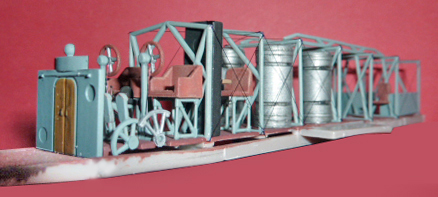 The roof is made from very thin, cut corrugated cardboard, bought from a very fine art store. The protection for the door guide rails is made from cut-out Coke cans...