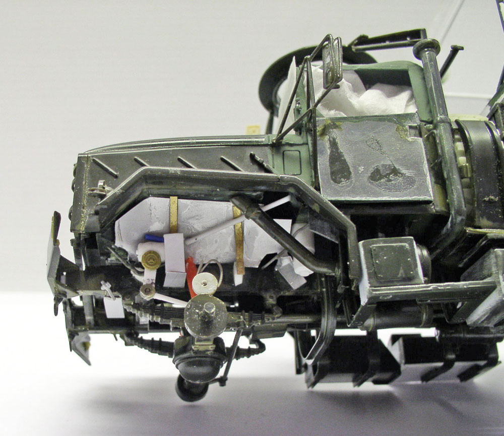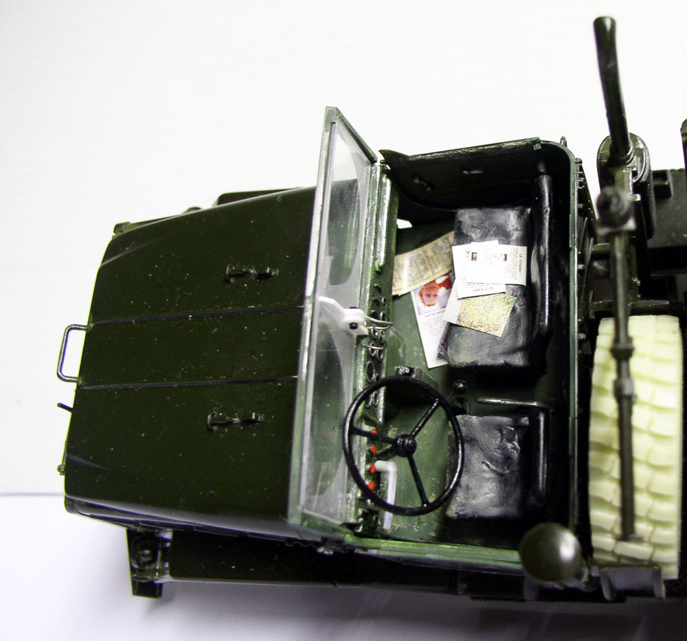 Vue plongeante sur la cabine: là aussi, des améliorations sont apportées au niveau du pare-brise et du tableau de bord. Après peinture, quelques documents et papiers sont collés sur les sièges et le plancher... Un voile de vernis mat simulera la poussière sur le pare-brise...