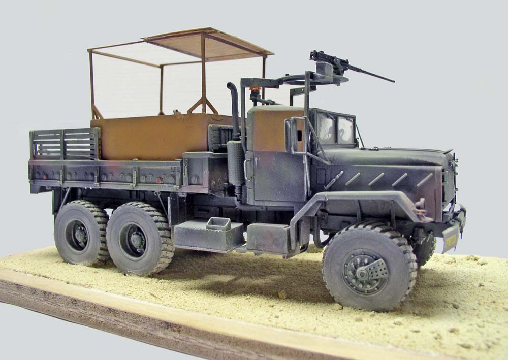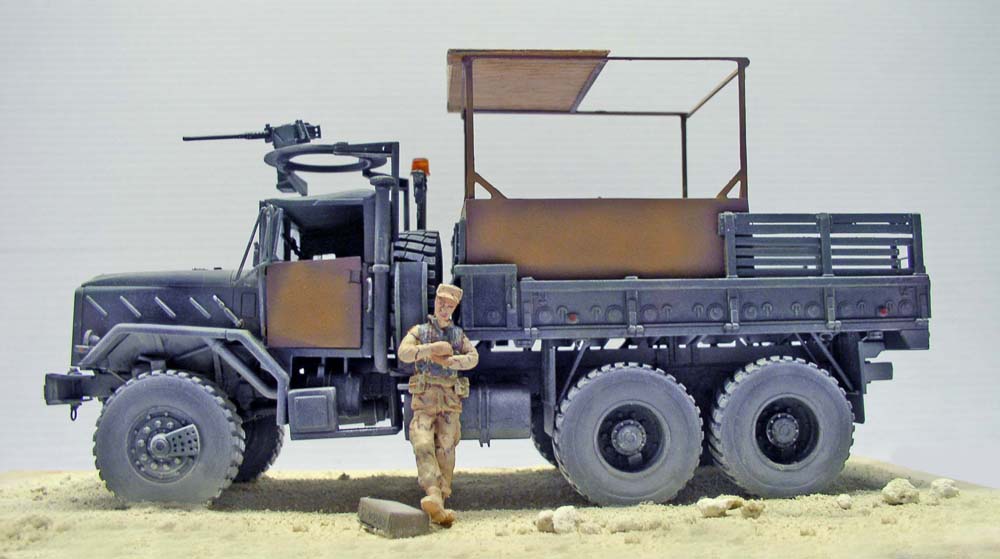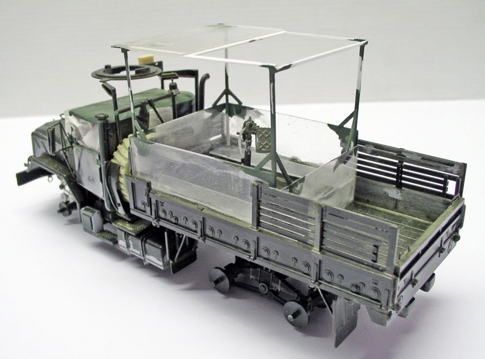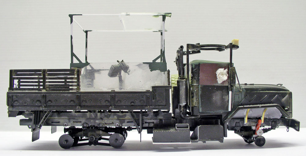 Ajout du support de la mitrailleuse fourni dans le kit. Une plateforme fabriquée en Evergreen viendra protéger les servants à l'arrière du soleil... La partie délicate: fixation du toit sur la cabine... Pas évident. Du mastic complètera la jointure...