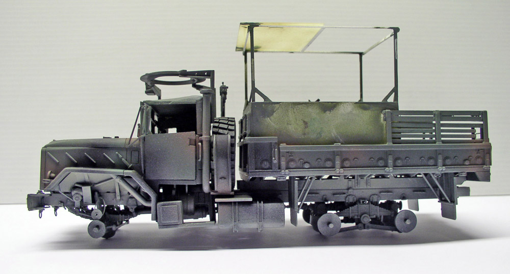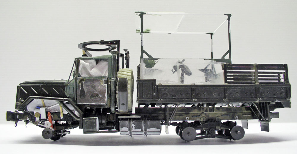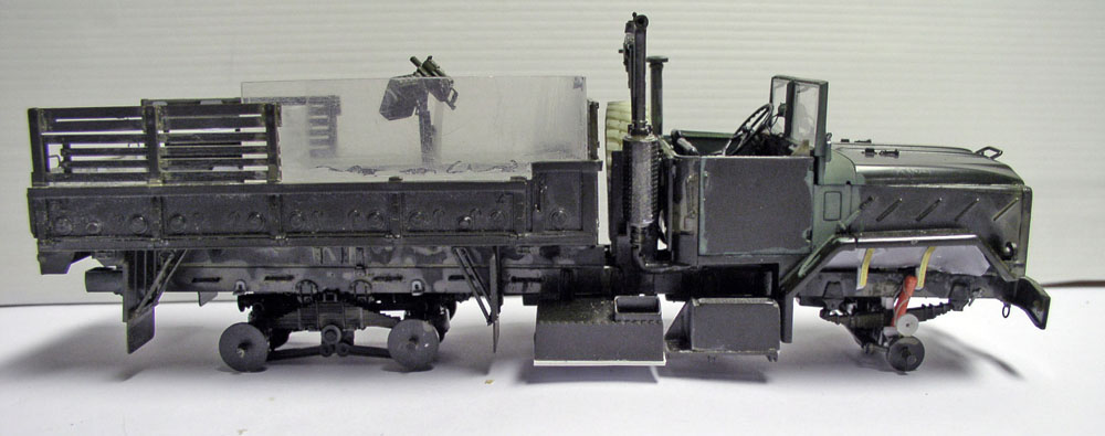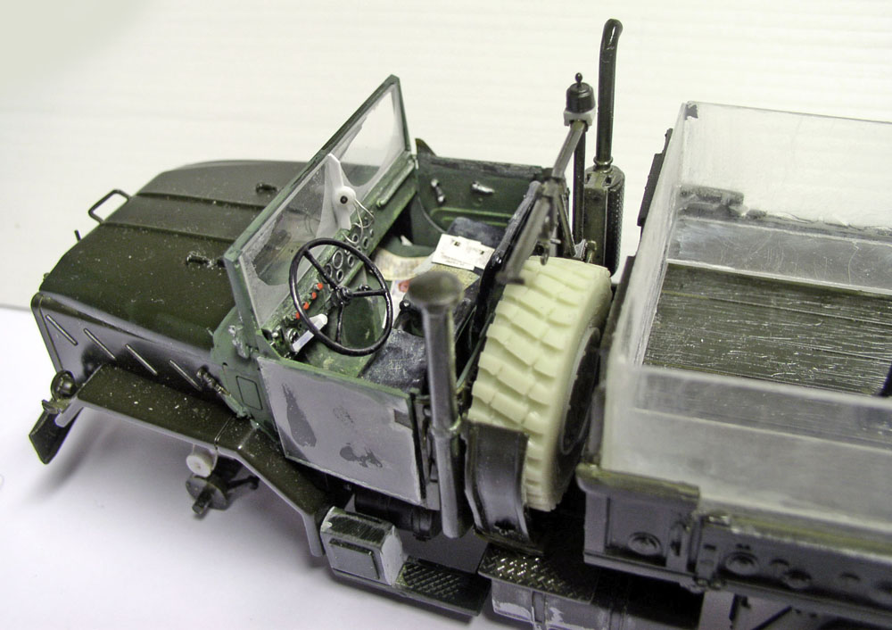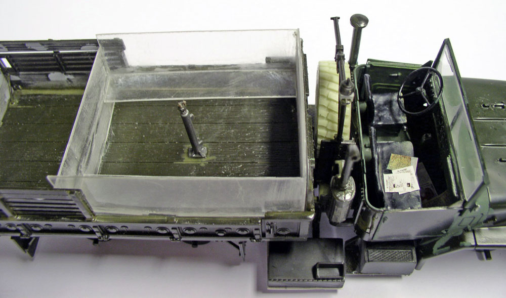 Top view: The spare wheel is in place, the cab mounted - as it will be closed. The foot of the grenade launcher is fixed to the floor, surrounded by armor plates...