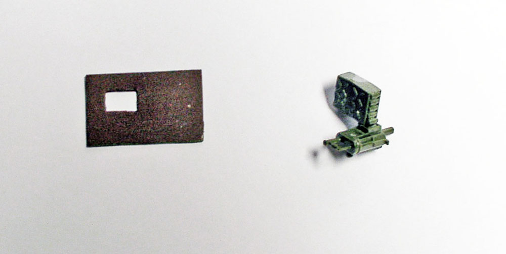 La plaque de protection ajourée de la portière droite en carte plastique et le lance-grenade récupéré sur un kit Tamiya...