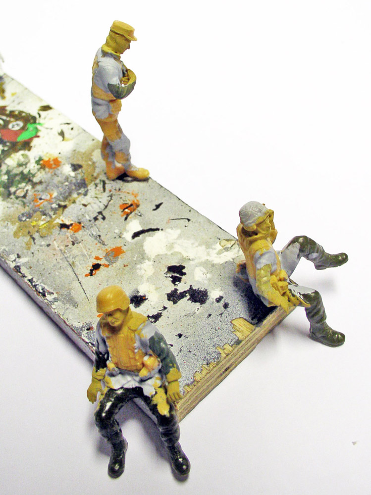La plaque de contreplaqué est elle aussi enduite de pastel. La figurine du chauffeur est collée sur une base de plâtre frais saupoudrée d'enduit mural où sera positionné le véhicule...