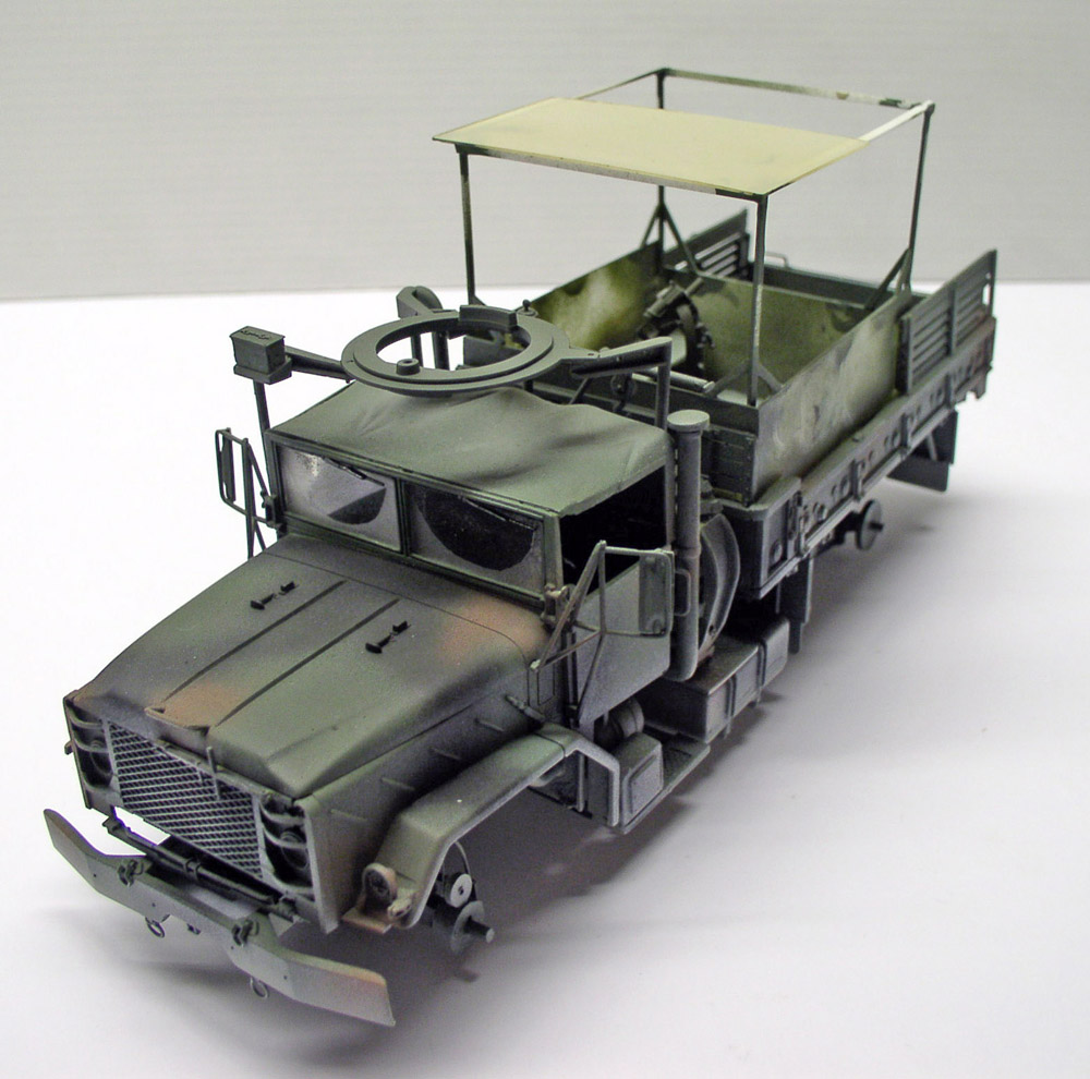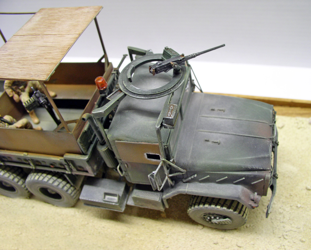 Addition of the machine-gun mount supplied in the kit. A platform made of Evergreen will protect the rear servants from the sun... The tricky part: attaching the roof to the cab... Not an easy task. Putty will complete the joint...