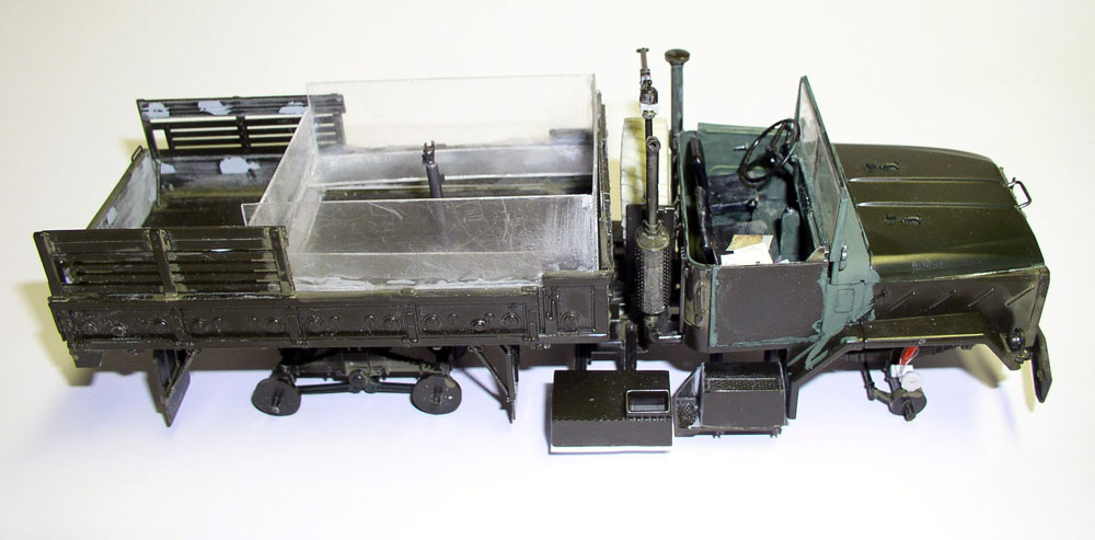 Vue de dessus: La roue de secours est en place, la cabine montée - car elle sera fermée. Le pied du lance-grenades est fixé sur le plancher entouré des plaques de blindage...