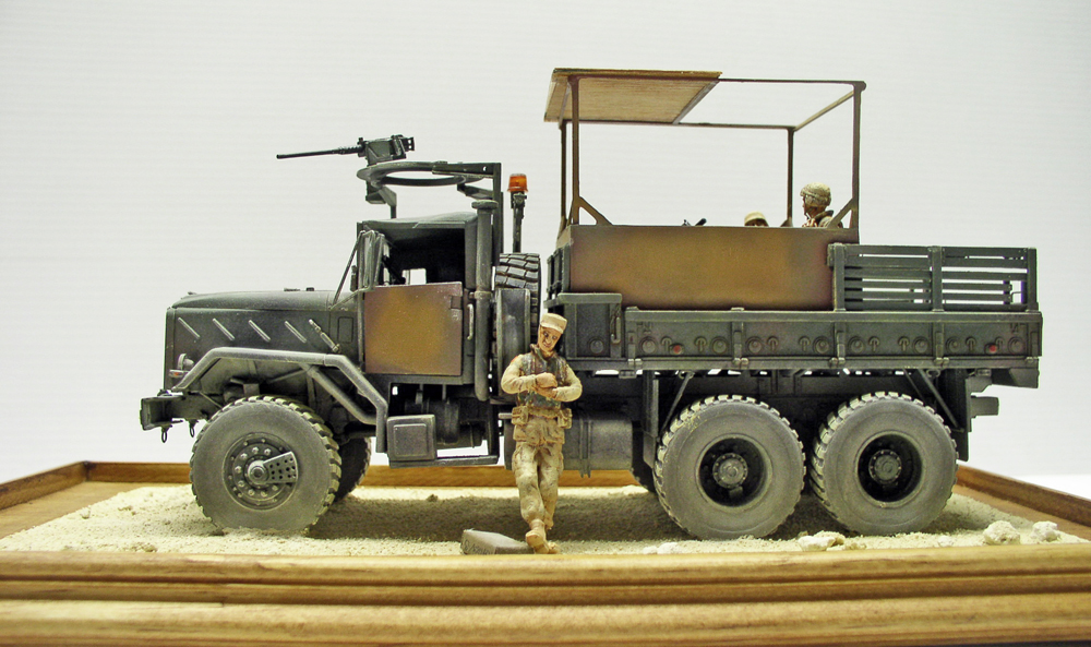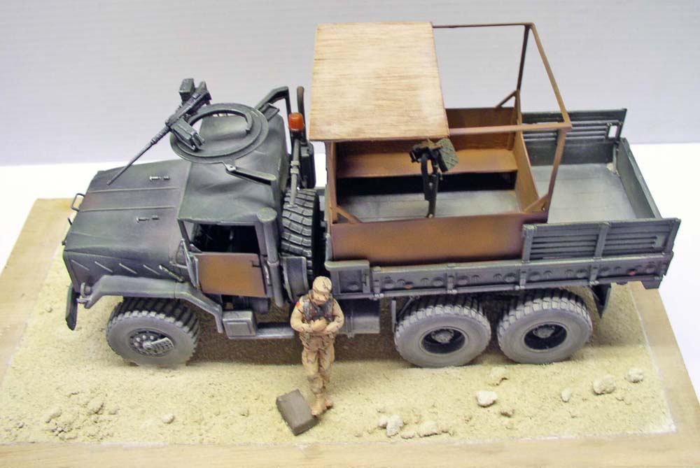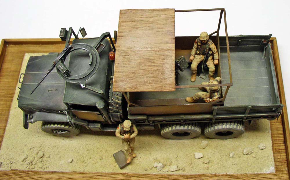 The perforated protection plate on the right-hand door is made of plastic card, and the grenade launcher was salvaged from a Tamiya kit...