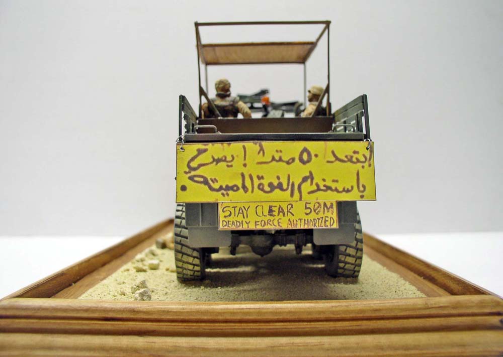 Addition of the warning sign. Following the numerous attacks in Iraq, many American Hummers and trucks from the Gulf War have a sign on the back with inscriptions in Arabic and English forbidding all vehicles to get closer than 50m on pain of protective fire...