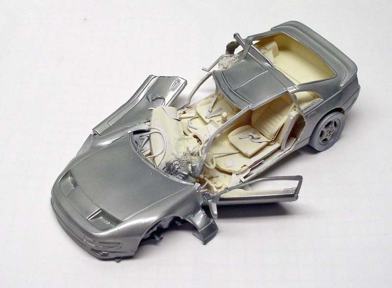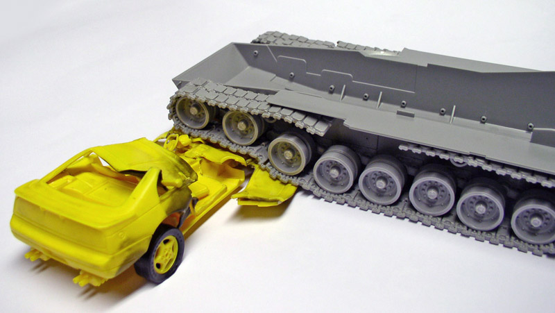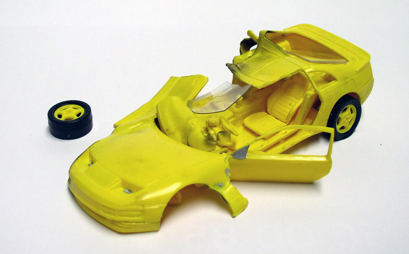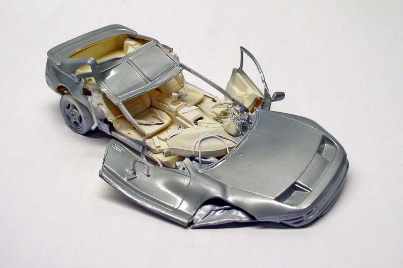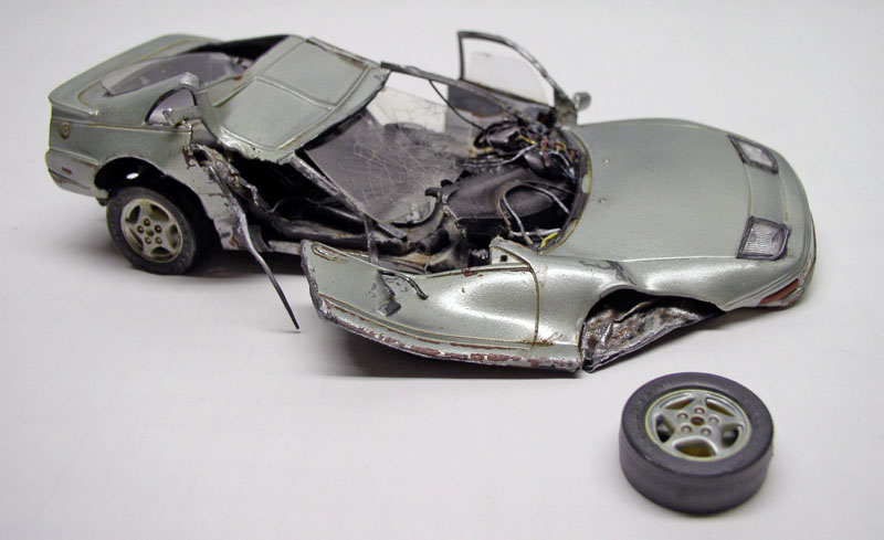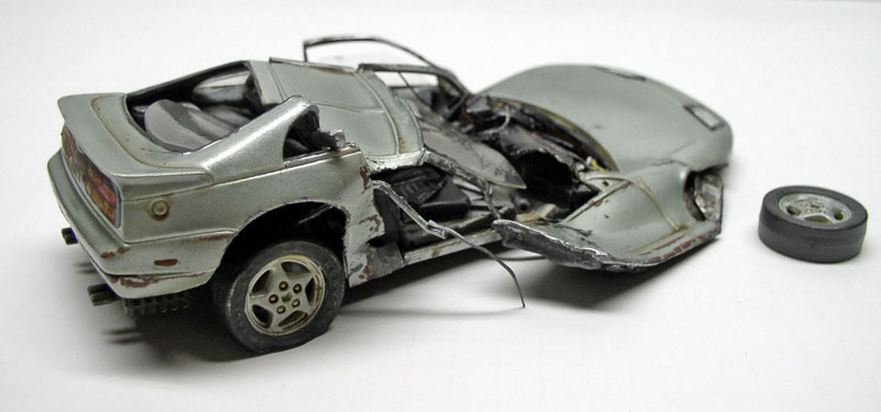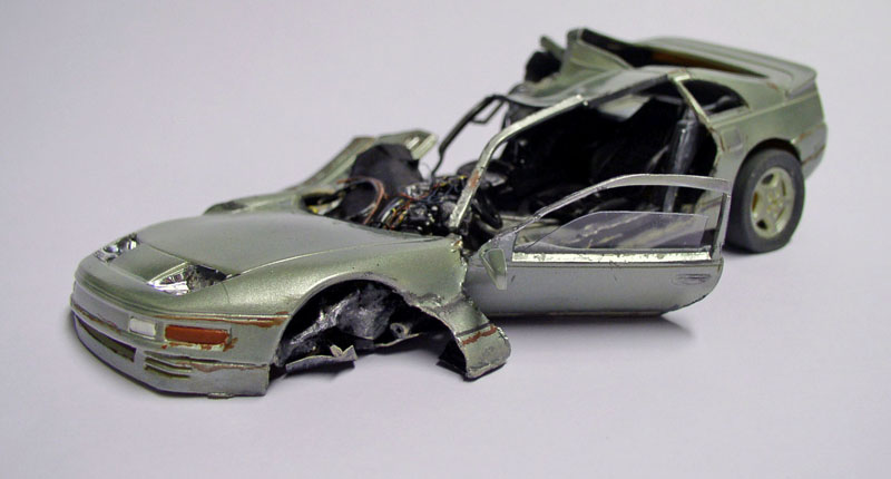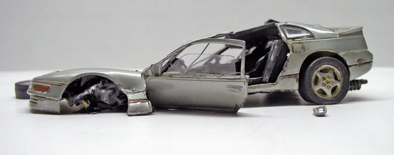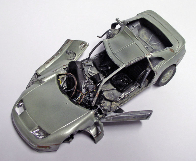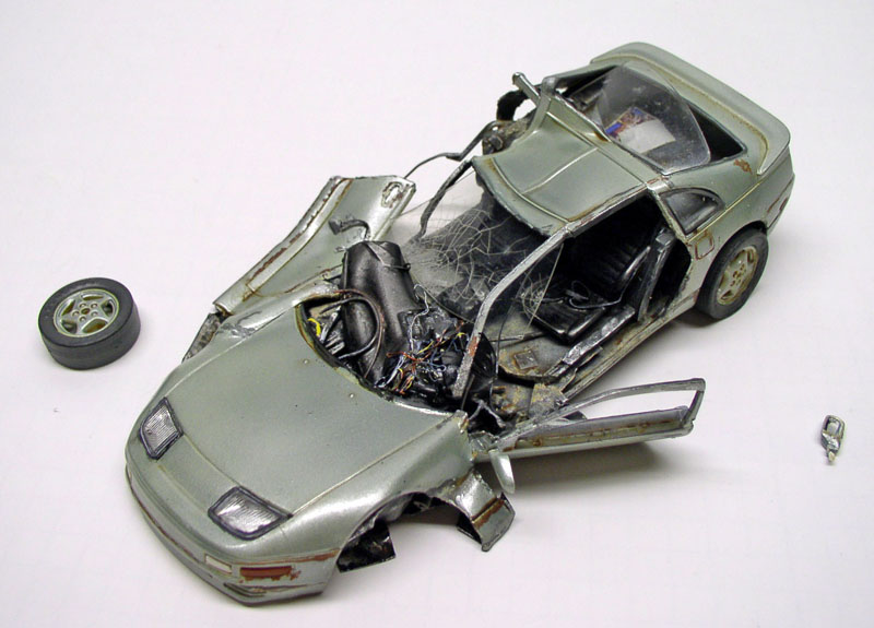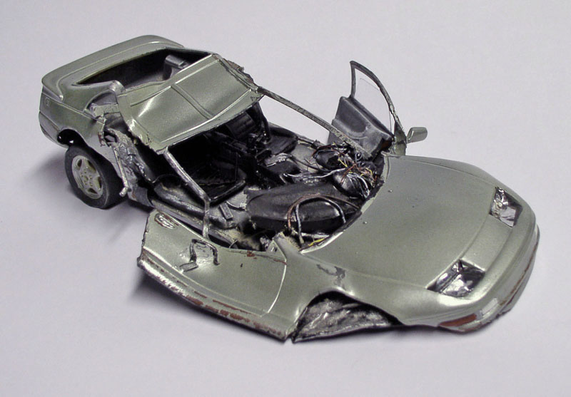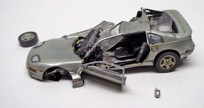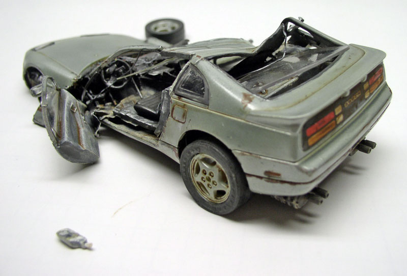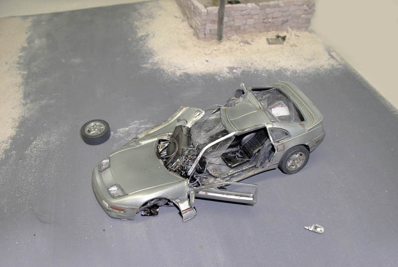 As no four-door sedan could be found at the time of assembly, a 1/32 scale Nissan was sacrificed to serve as a wreck...