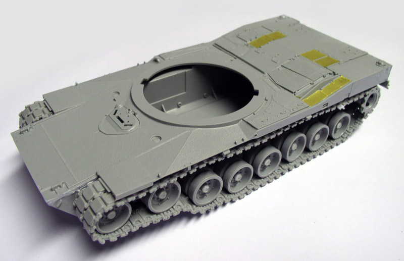 Le blindé. Les chenilles - patin par patin - ainsi que les nombreuses pièces des barres de torsion du train de roulement n'ont pas facilité la modification mais ces détails renforcent le réalisme. Pose des grilles moteur en photo-découpe. A noter que tout le compartiment moteur s'assemble pièce par pièce et laisse prévoir la possibilité d'insérer un moteur...