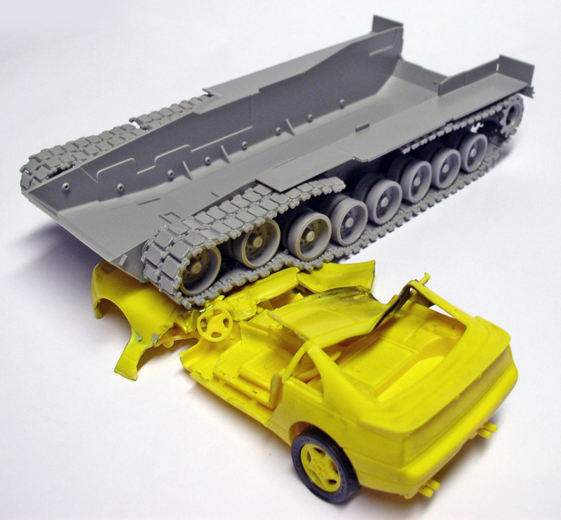 Le char, dont la suspension et la chenille gauche ont été modifiées et la voiture doivent "coller" ensemble et ne faire qu'un...