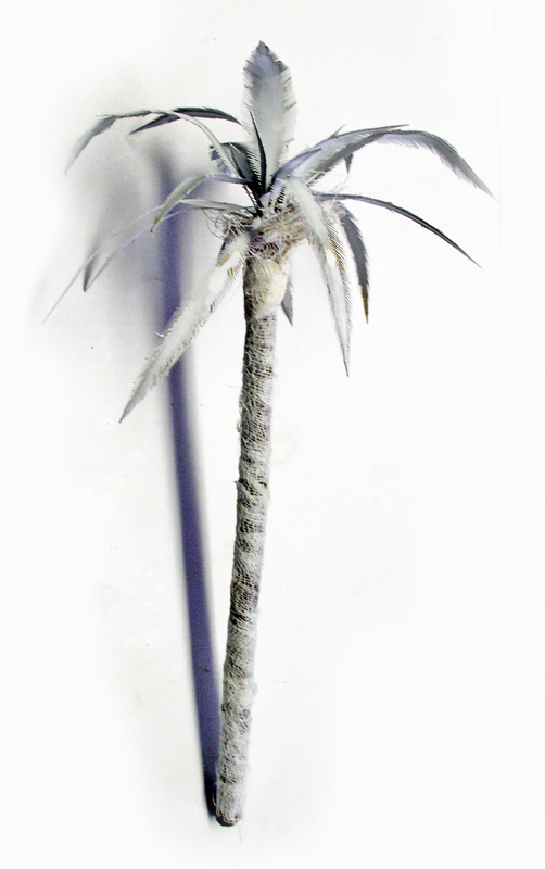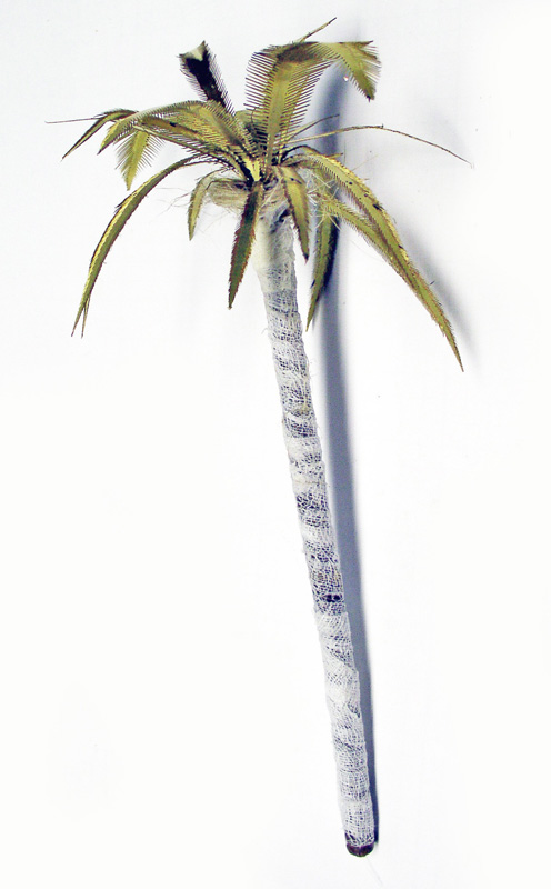 On entoure le tronc d'une bande de gaze trempée dans la colle à bois liquéfiée, en la posant en recouvrant légèrement la bande précédente. On finit sous les feuilles en entourant de la fillasse de plombier qui simuleront les fibres du palmier. Une couche d'apprêt et il n'y a plus qu'à peindre !...