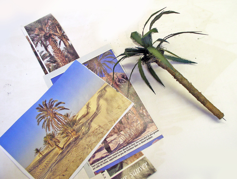 Le palmier en place; Malgré le prix hautement élevé de ce style de photodécoupe, le rénurage des feuilles n'a pas été prévu .Il reste donc deux possibilités: les fabriquer et les coller ou les peindre en "trompe-l'oeil". La seconde solution a été adoptée...