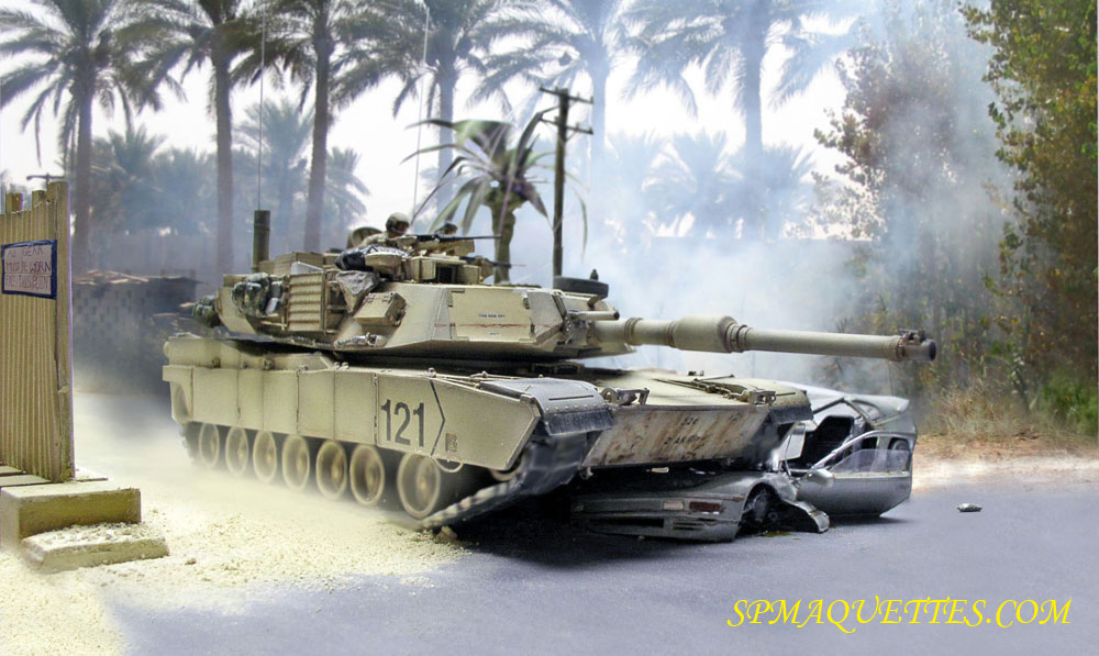 Fer de lance des deux guerres du Golfe, le M1 A1 Abrams méritait un diorama qui le mette en valeur. La photo ci-dessus donne une idée de la puissance et la masse du véhicule et devint une bonne source d'inspiration pour une scènette...