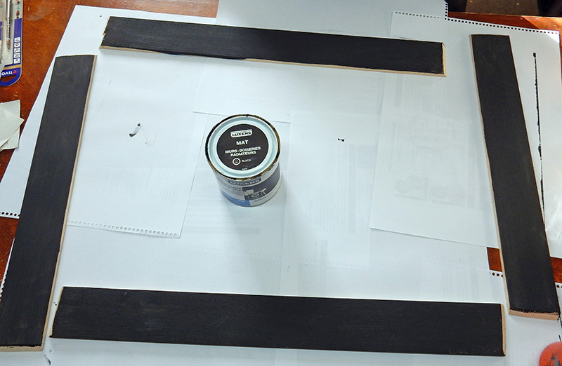 Préparation du cadre : des panneaux de bois découpés et peints avec un noir mat acrylique...