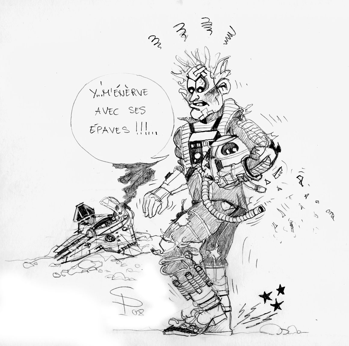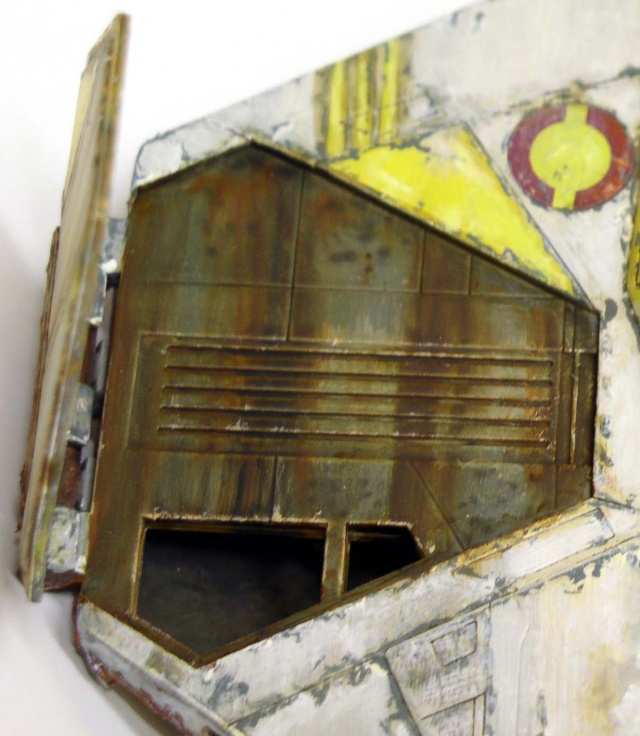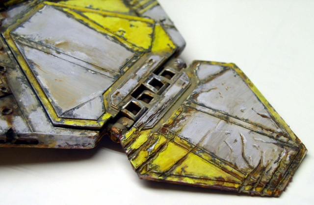 On va à nouveau s'occuper de la partie supérieure du vaisseau. Avec un pinceau fin et des huiles en tube (WINSOR toujours) on va le rendre plus réaliste en créant des "trompe-l'oeil". Pour faire une fissure, on trace un premier trait foncé pour la dessiner, et on réalise un liseré plus clair pour simuler le relief et donner l'impression d'aspérités. On créé aussi des tâches plus ou moins estompées...